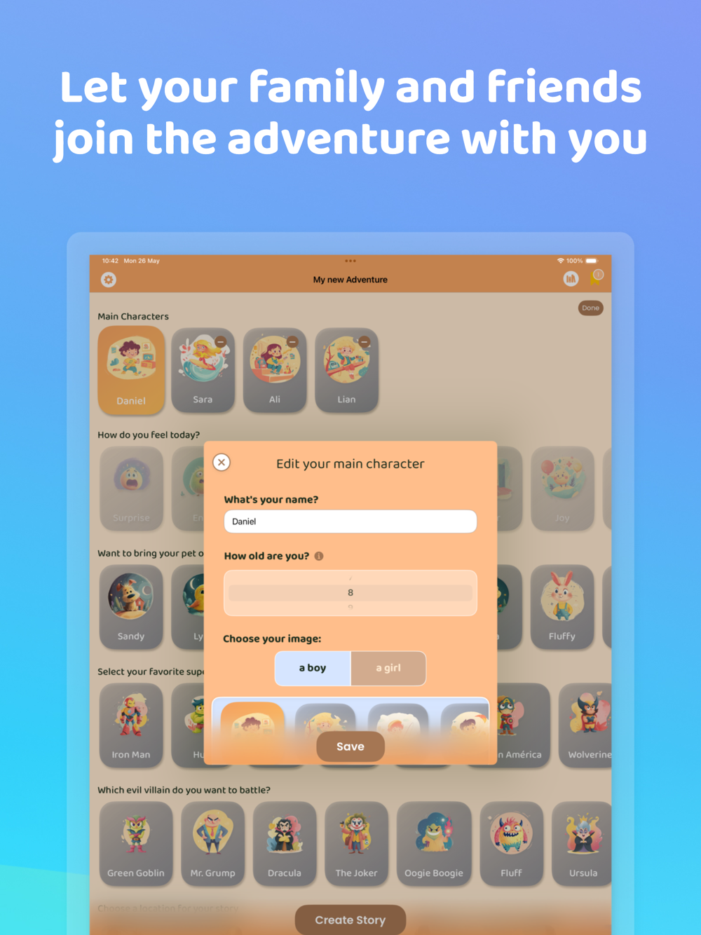 يتكيف الذكاء الاصطناعي مع عمر واهتمامات ومشاعر طفلك. من الحكايات الخيالية إلى مغامرات الأبطال الخارقين أو القصص عن المشاعر، هناك شيء سحري لكل طفل.