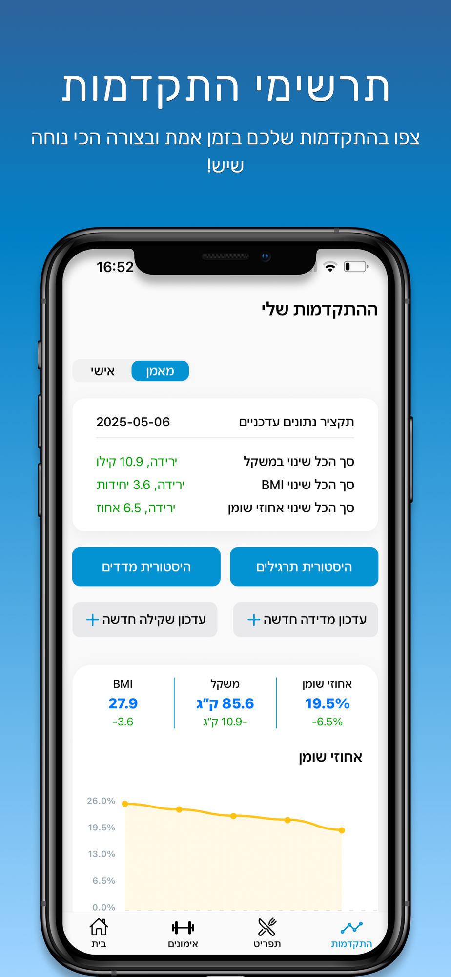 מעקב אחר שקילות ונתוני גוף – הזנת נתונים כמו משקל, אחוזי שומן, מדידות היקפים ועוד.