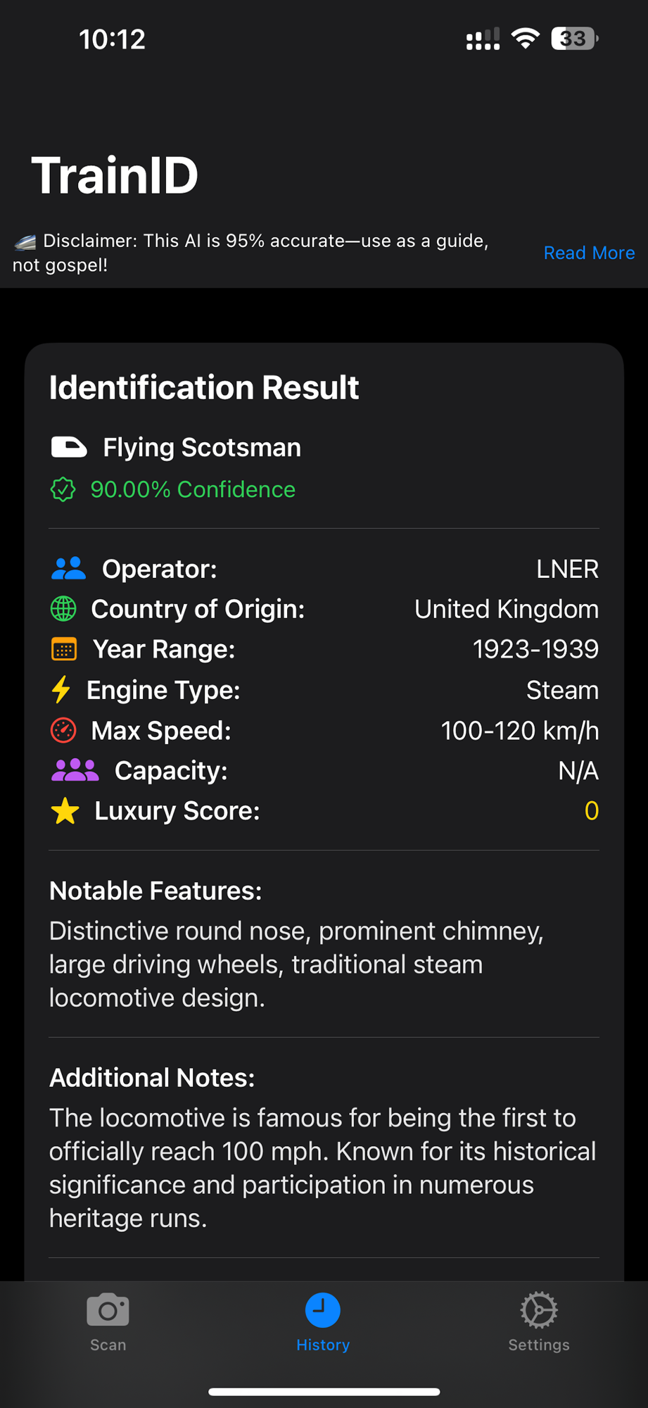 Your scan history is automatically saved—perfect for railfans and professionals tracking different fleets or spotting unique liveries. Clear history anytime or revisit your favorites.