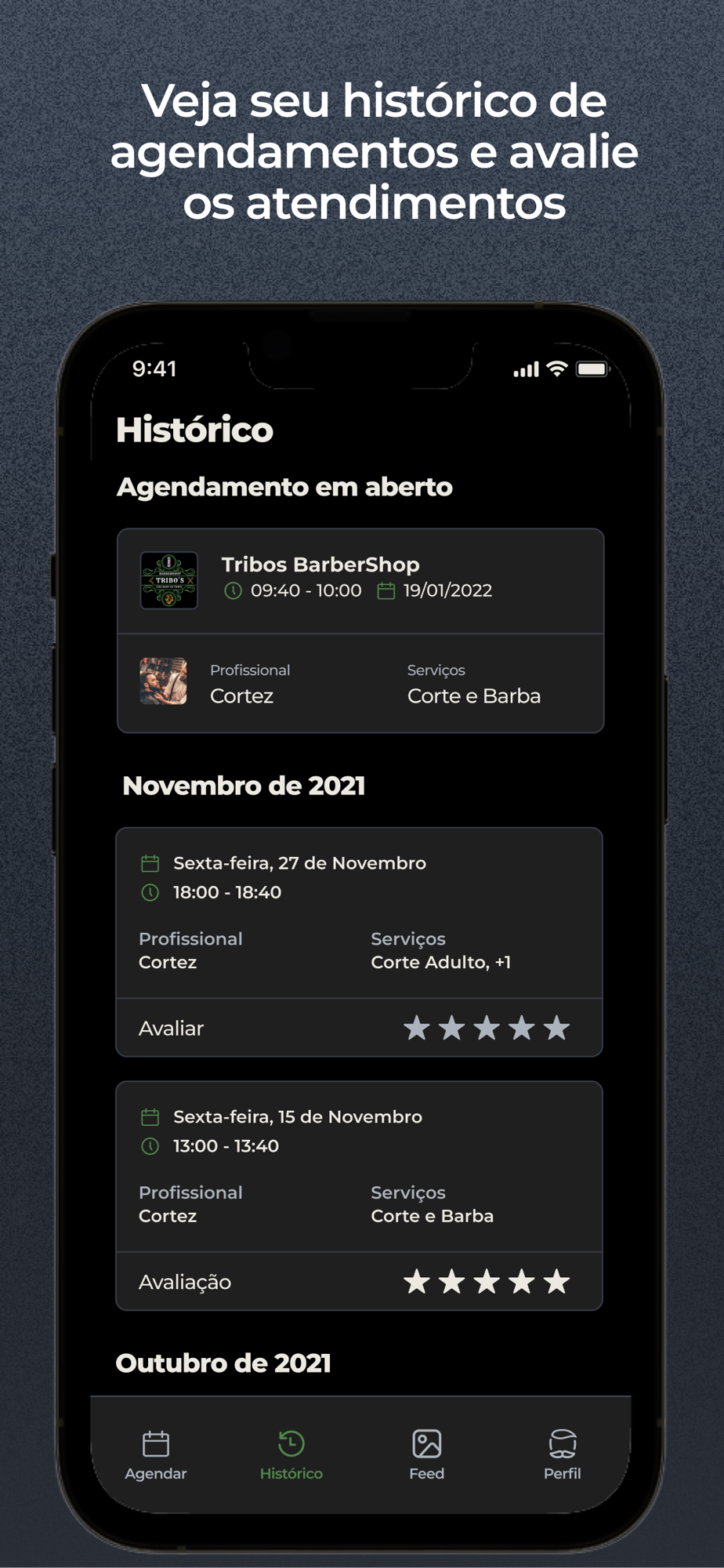 Através do App Tribos BarberShop os clientes podem realizar seus agendamentos de uma forma muito mais prática. Na tela inicial, é possível selecionar os serviços e horário desejado para seu próximo atendimento. Já na tela de histórico, você poderá avaliar como foi o seu atendimento, remarcar ou cancelar seus agendamentos. É possível também na tela do perfil o cliente editar suas informações, como e-mail, foto de perfil e telefone.
