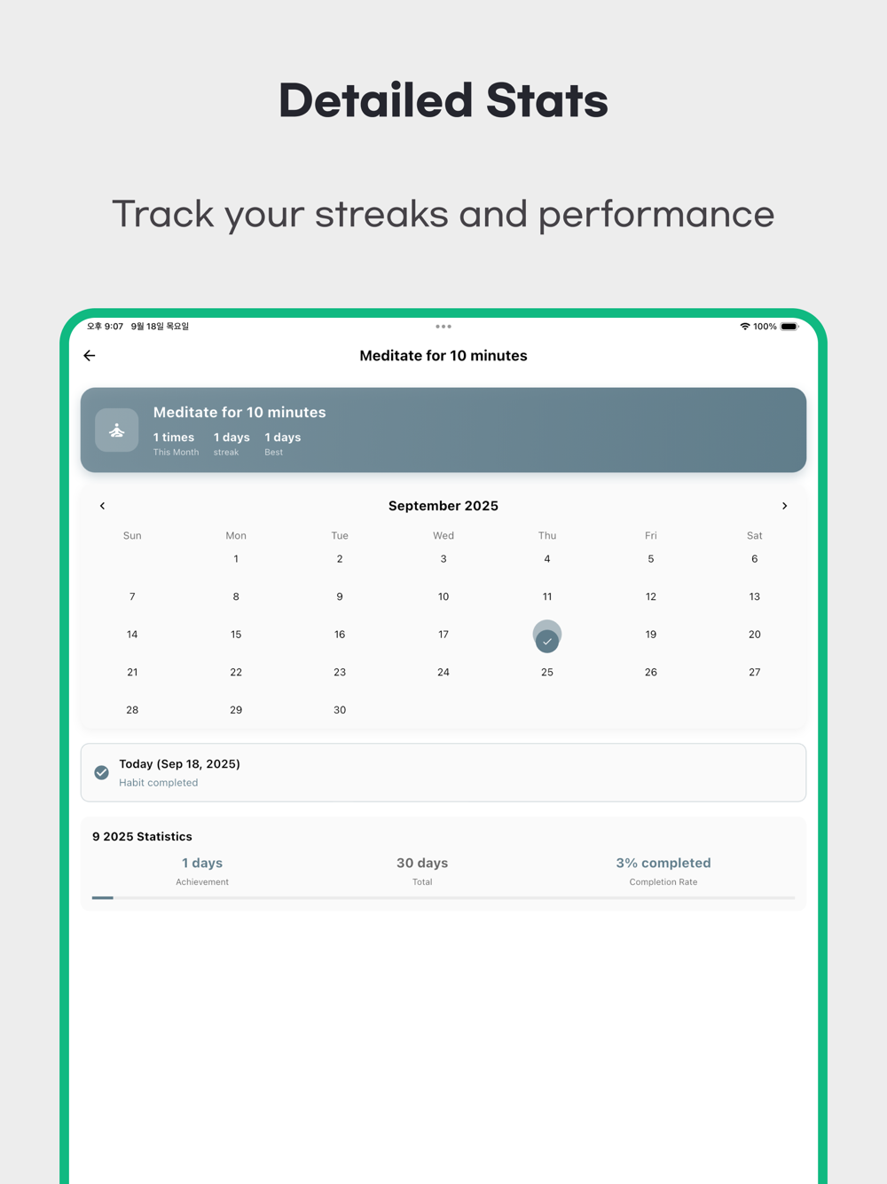 No clutter. This clean habit calendar only shows your habit records and achievements. Check your daily progress on this simple goal tracker in the most intuitive way.