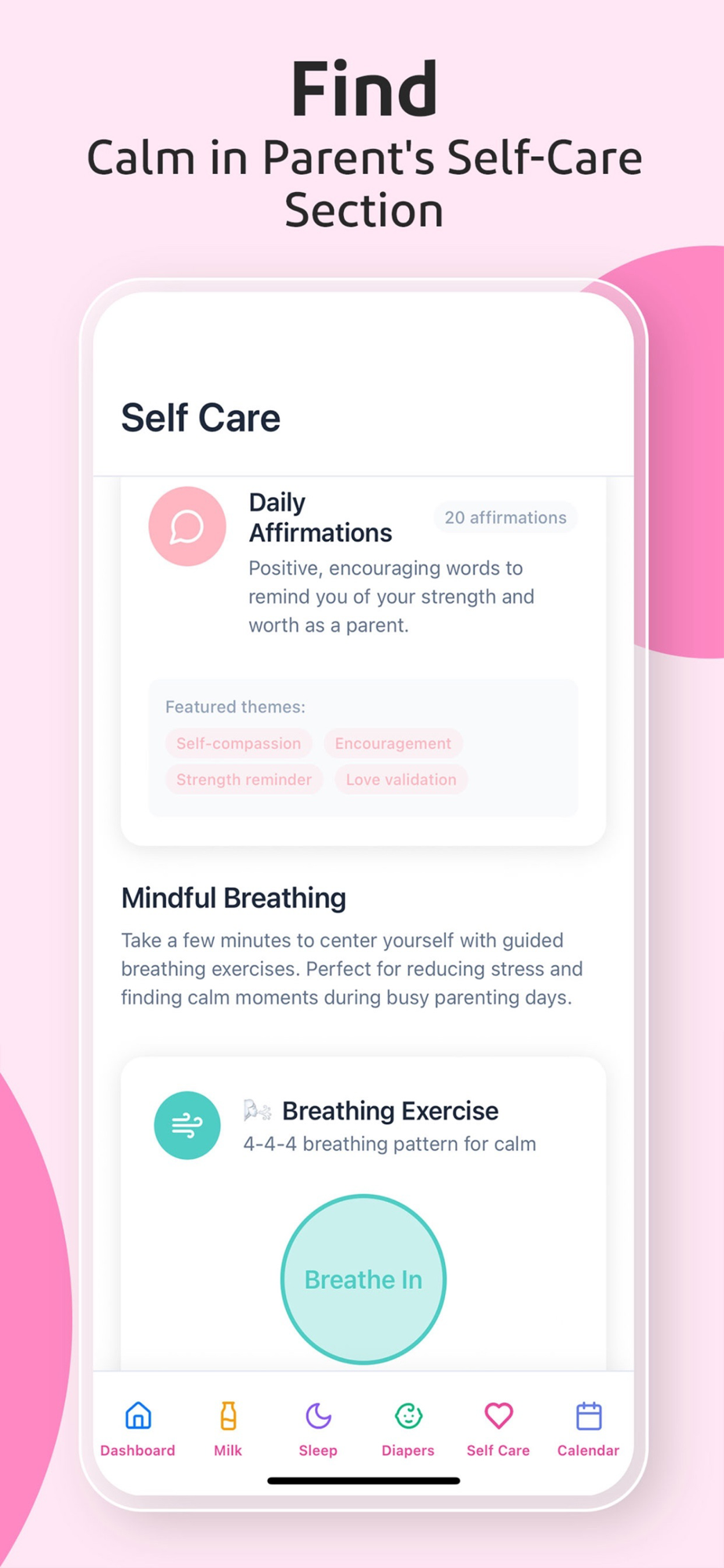 SELF-CARE FOR EXHAUSTED PARENTS Because taking care of yourself means taking better care of your baby. Daily affirmations, breathing exercises, and gentle reminders that you're doing an amazing job.