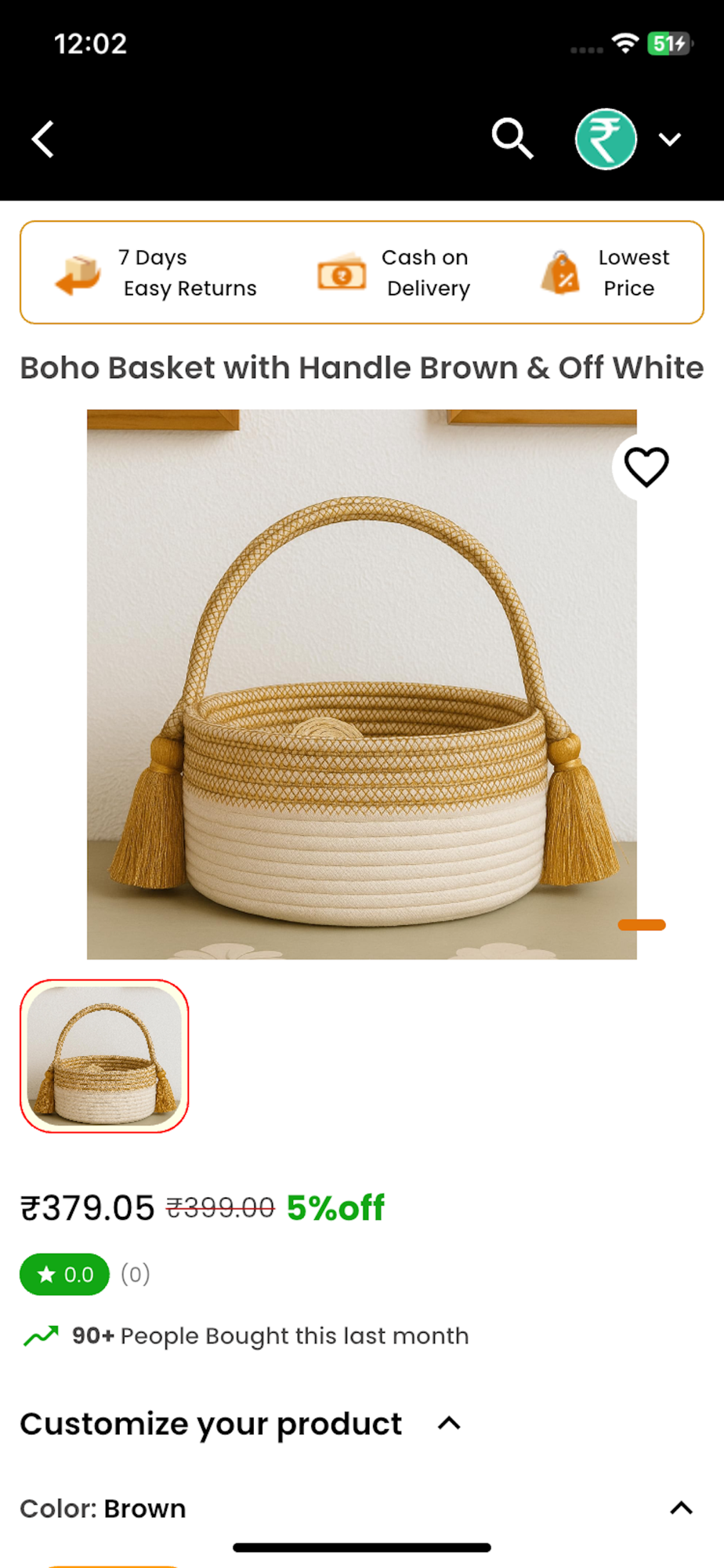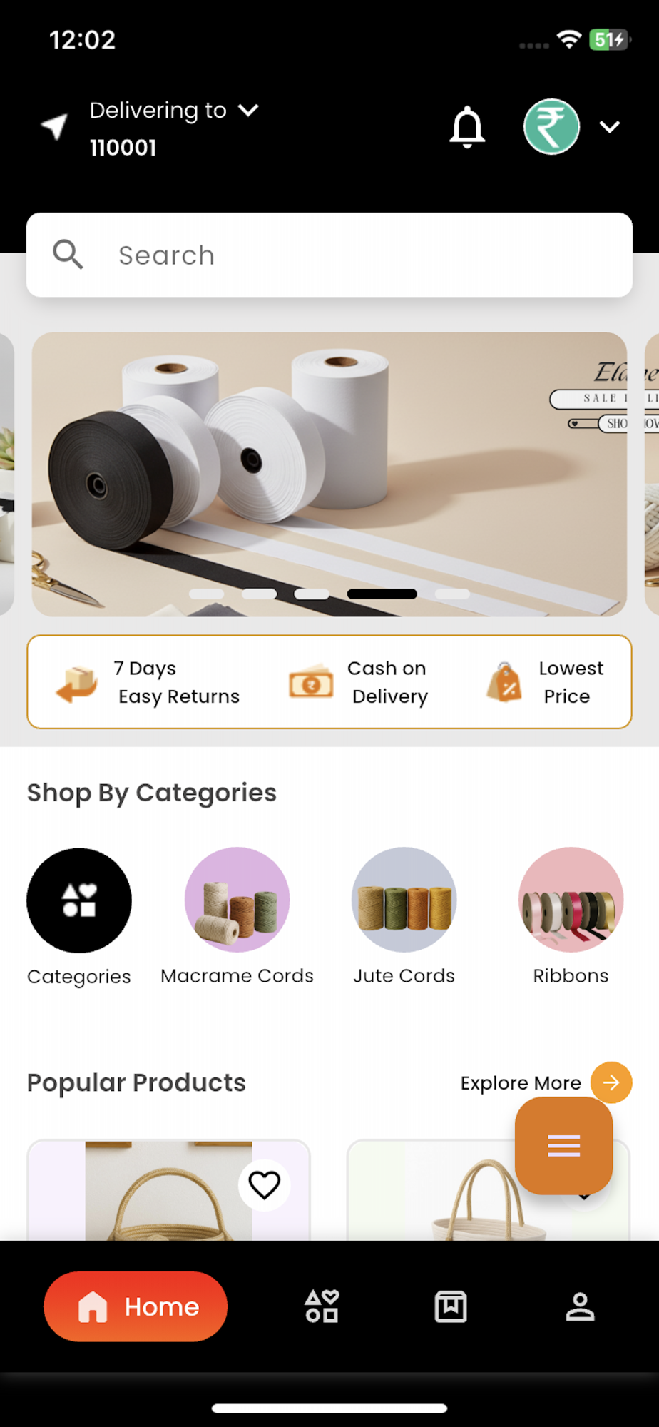 Enjoy seamless navigation, secure checkout, and quick delivery across India, along with reliable features like wishlist, order tracking, and exclusive app-only deals. We offer free shipping, cash on delivery, 7-day hassle-free returns, and 24/7 customer support to ensure your shopping experience is worry-free. From cotton macrame cords and crafting supplies to handmade baskets and pooja essentials, every product is chosen with care to bring a touch of beauty and utility to your space.