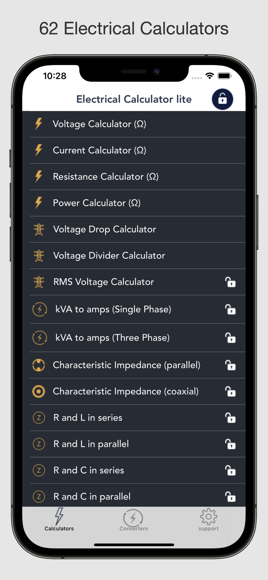 The App Electrical Calculator - lite consists of 62 Calculators related to Electrical Engineering with formulas and multiple Units.supports both USCS and SI Units of measure.