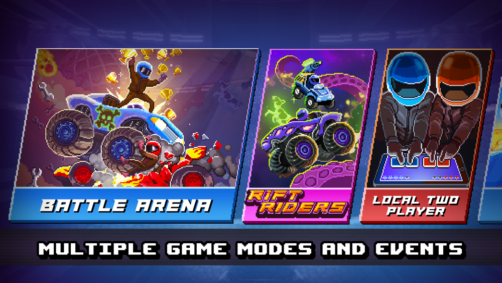 Hundreds of pixel cars, helmets, levels, missions, and game modes bring endless hours of helmet-crashing two-player racing action with freak accidents!
