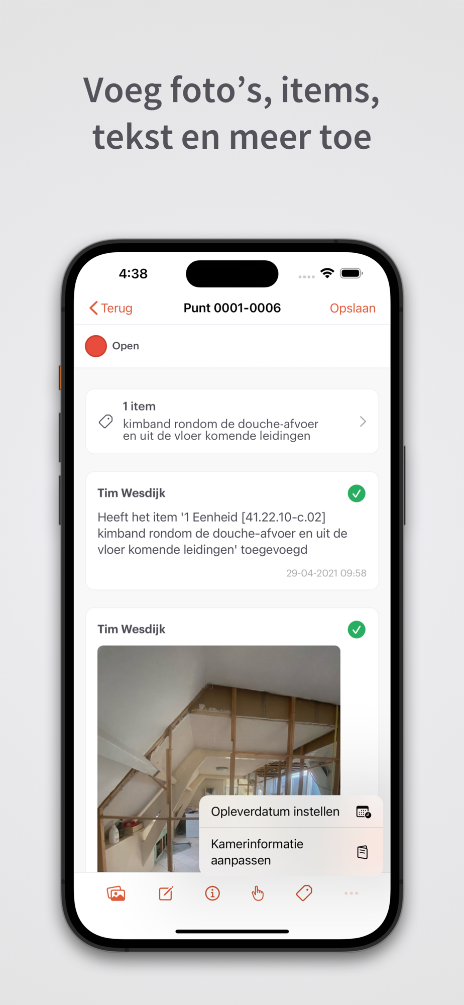 - Foto's, tekst, items, een status, een opleverdatum, een kamerinformatie toevoegen aan een inspectiepunt