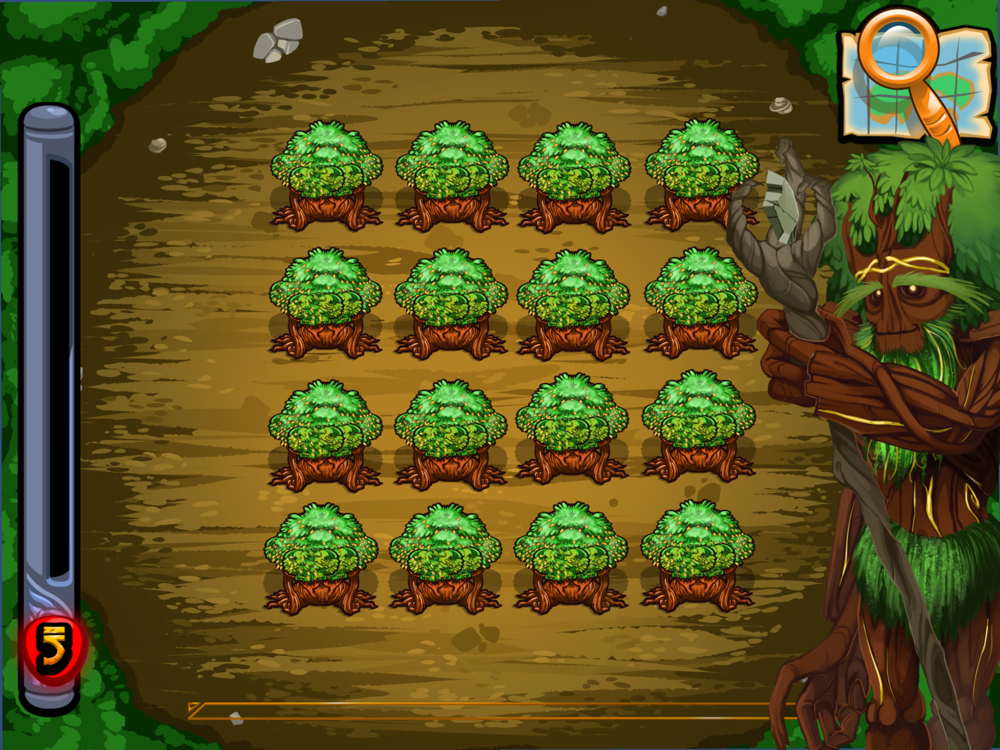 Entene som vi finner i det tredje aktivitetsområdet, er små trær som står på rekker. Her er det ren arbeidsminnetrening, hvor oppgaven blir å huske rekkefølgen på hvilke trær som beveger seg når. Det starter med få trær, men antallet justeres opp (eller ned) etter hva barnet klarer å huske. Målet er å være i yttergrensen for hvor mye arbeidsminnet klarer, for på den måten å forbedre kapasiteten samt gi barnet noe å strekke seg etter.