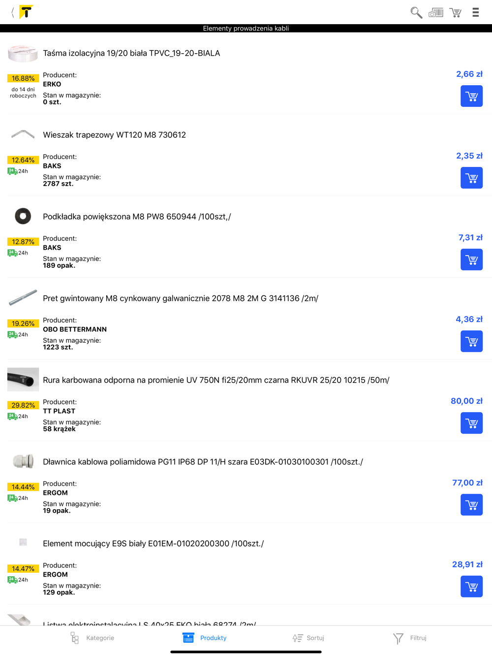 Wygodne wyszukiwanie - Wyszukuj produkty z każdego miejsca w aplikacji, podając: nazwy produktów, ich cechy (np. kabel yky 1kv), indeks producenta, indeks TIM SA, nazwę kategorii (np. źródła światła), nazwę producenta, kombinację nazwy produktu z nazwą producenta. Także głosowo bądź za pomocą "+" i "-".