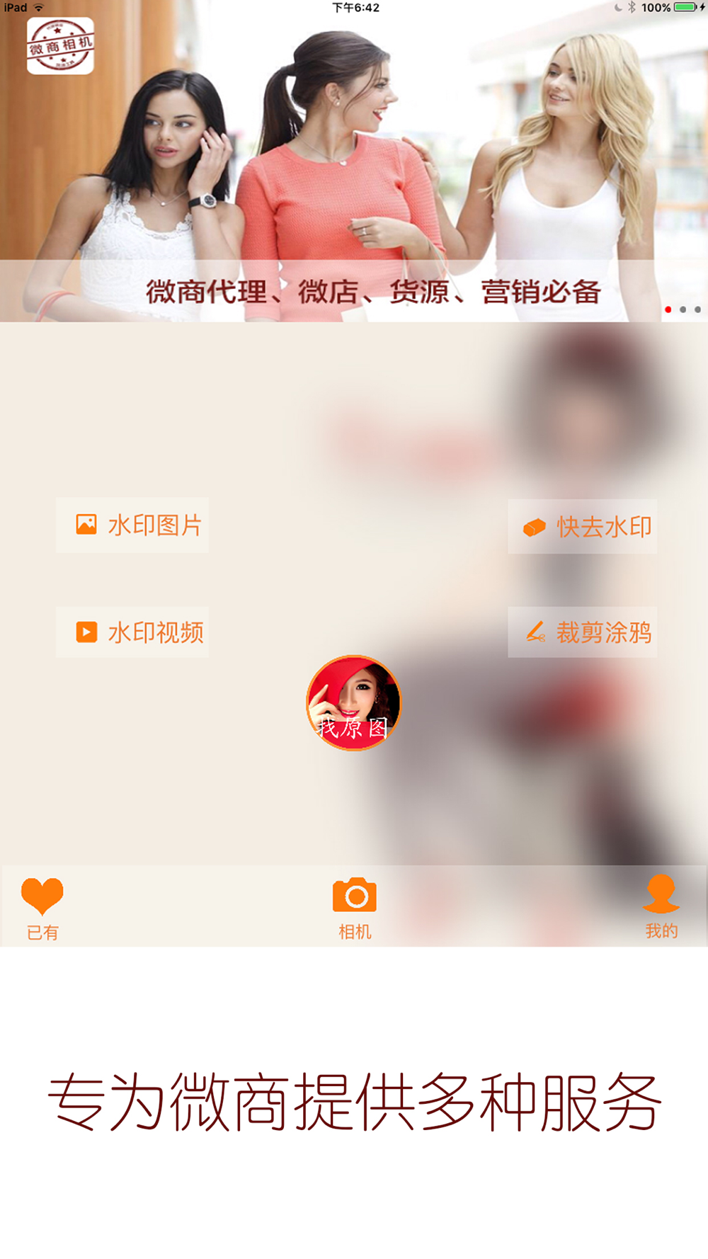 微商玩代理、微店、货源、赚钱必备水印修图视频相机。微商相机专为微商设计,集水印视频,秒拍快速加水印,去水印,裁剪,涂鸦,找原图,批量水印制作等功能的平台。帮助微商生意更好,更赚钱。