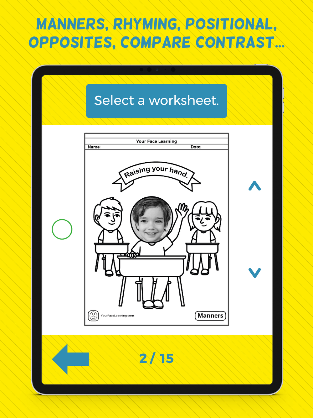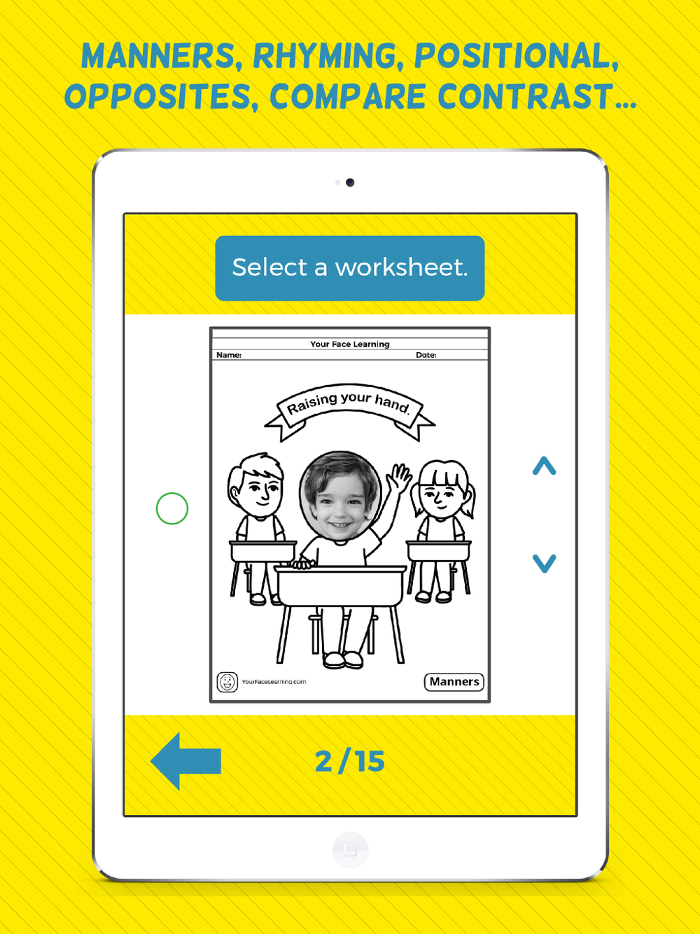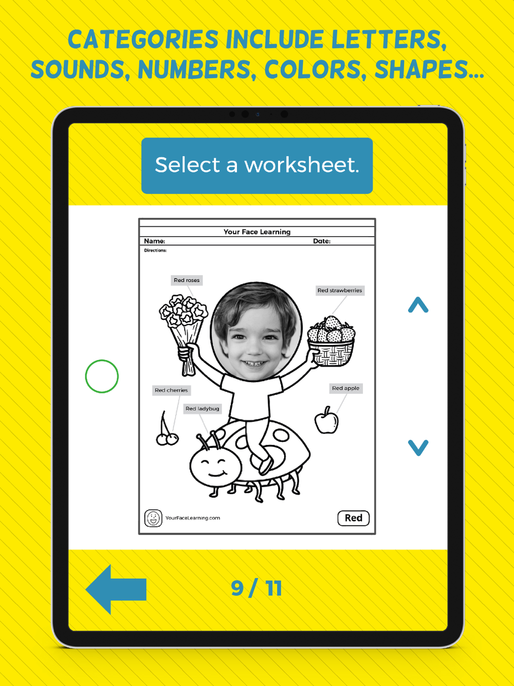 With just a few taps on your device, you're easily able to snap a photo of your young learner’s face and it automatically gets added to a massive amount of category-specific early learning worksheets (PDF files). The personalized touch of seeing your face in your worksheet is truly second to none!