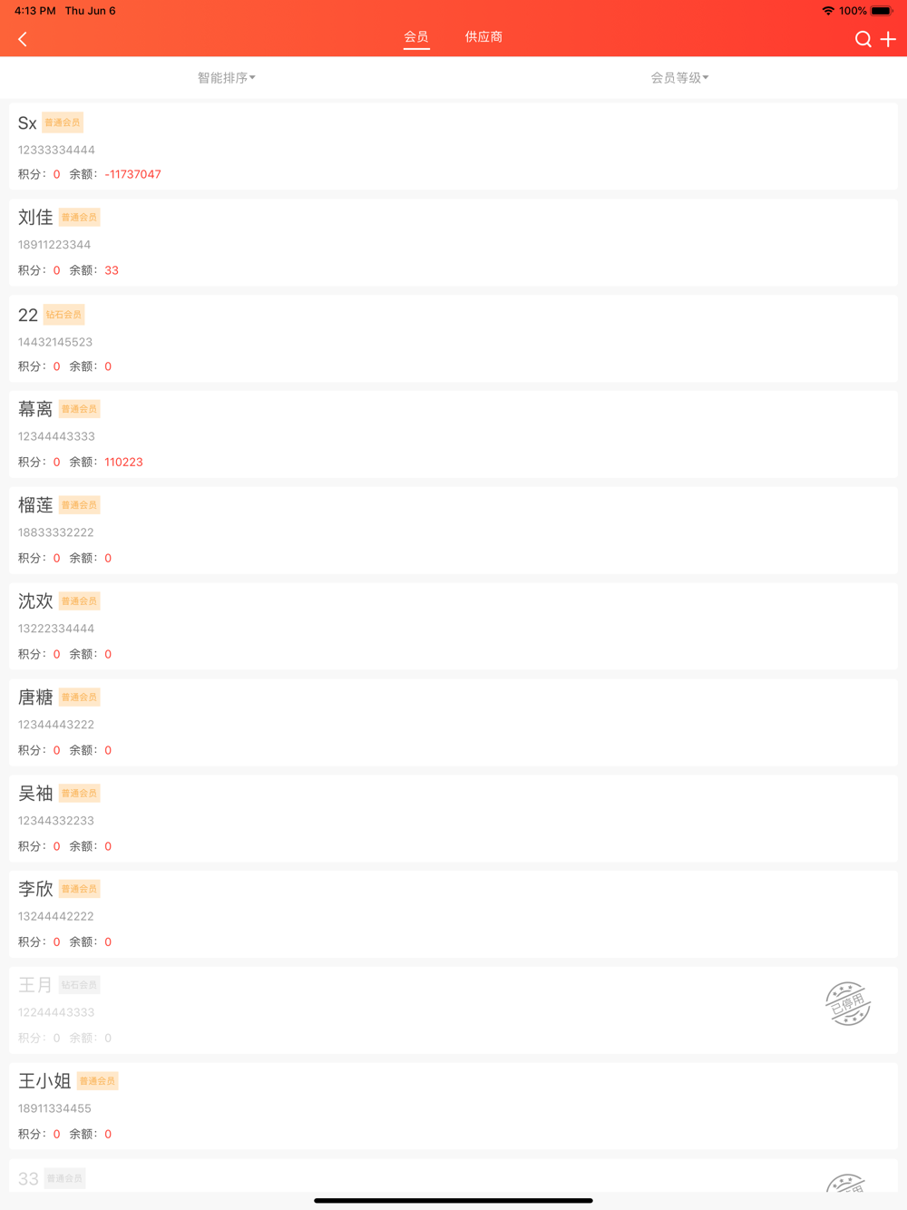 2、会员管理,管理会员的储值、消费、积分,分析会员的消费习惯,支持会员的消费回访;