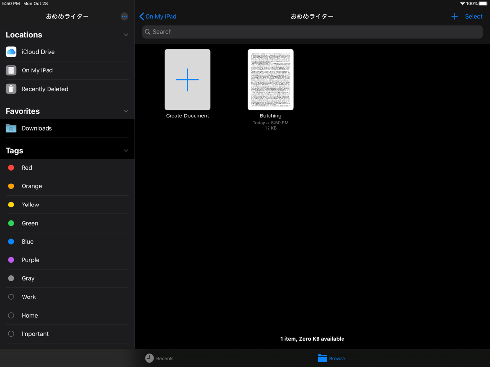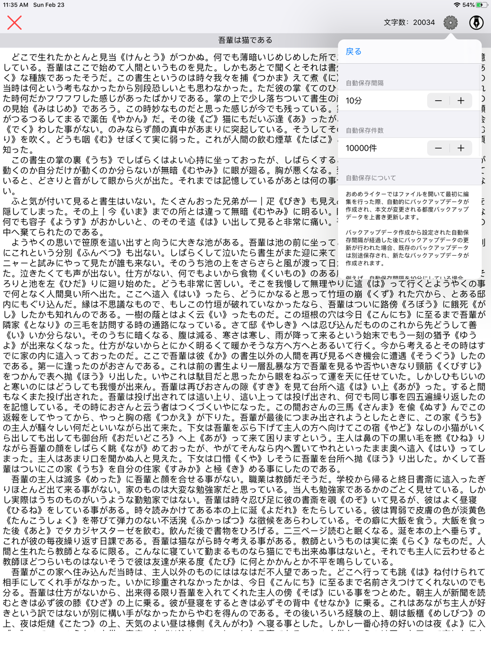 原稿データはiCloudドライブに保存でき、データ形式はメモ帳で開ける「.txt」形式です。つまり、おめめライターで作成した原稿は自宅PCから続きを書くことが可能。逆に、PCで作った原稿をiCloudドライブに保存すれば、おめめライターで続きを書くこともできます。万が一iPhoneやiPadを紛失しても、データが失われることはありません。