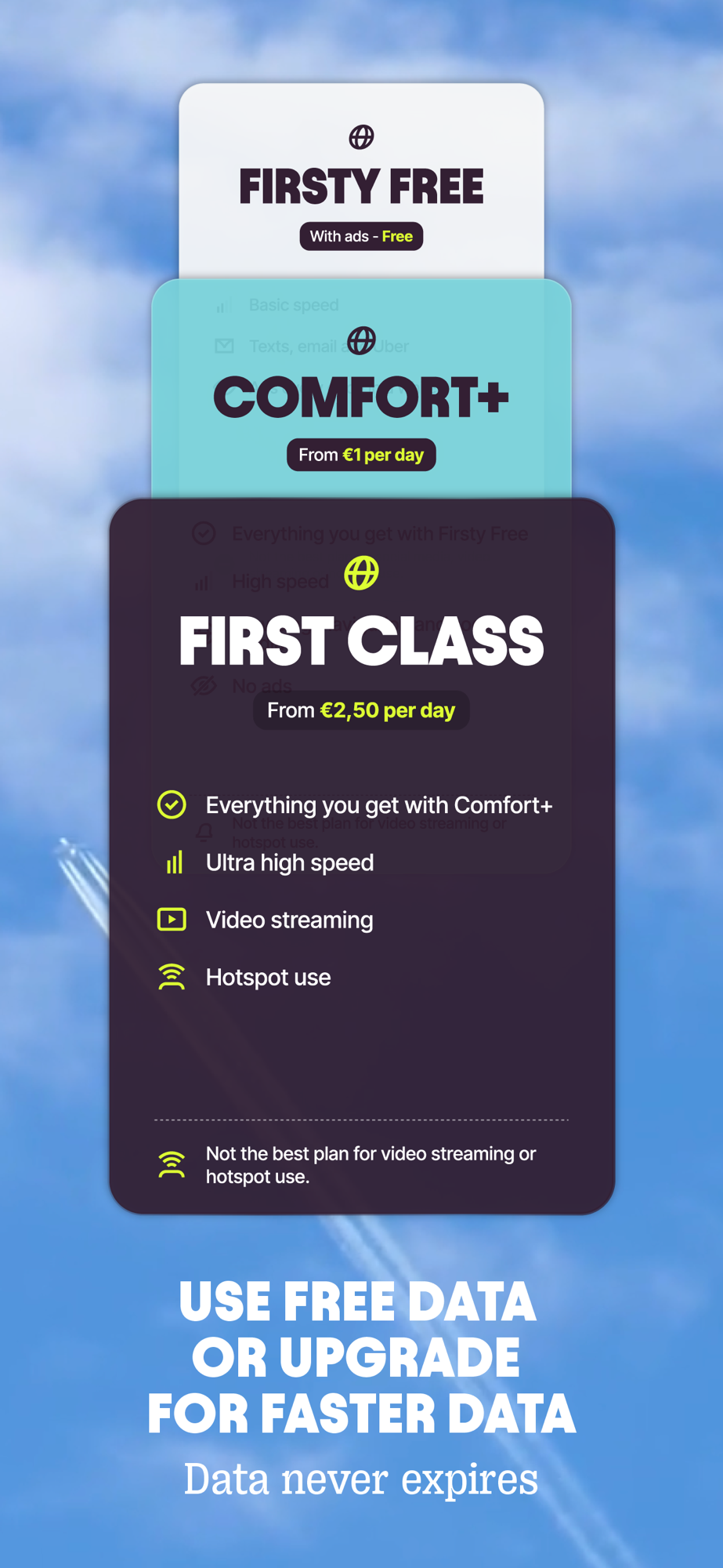 Firsty First Classは、高速インターネット接続をお楽しみいただけるプレミアムeSIMデータプランです。Spotify、Netflix、Appleなどのサービスで、音楽、番組、映画などのアプリやストリーミングをご利用ください。スマートフォンをホットスポットとして利用し、高速データ通信でリモートワークを。広告を見る必要はありません。