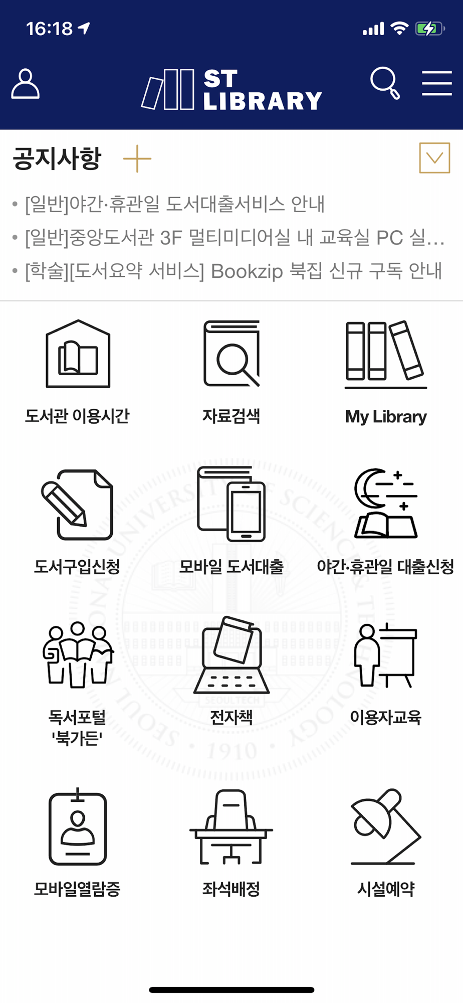 - 나의 도서관 이용현황 조회 : 대출, 예약, 연체, 제재현황 및 개인공지사항 확인