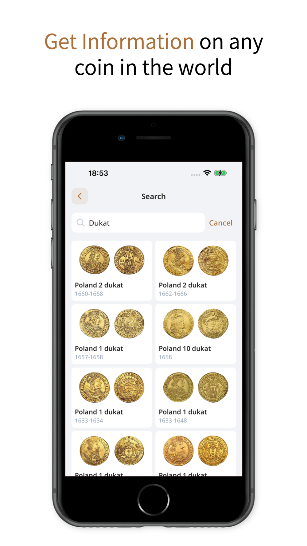 The application's vast database offers comprehensive details on each coin, such as its name, country of origin, year of issue, coin populations, and more.