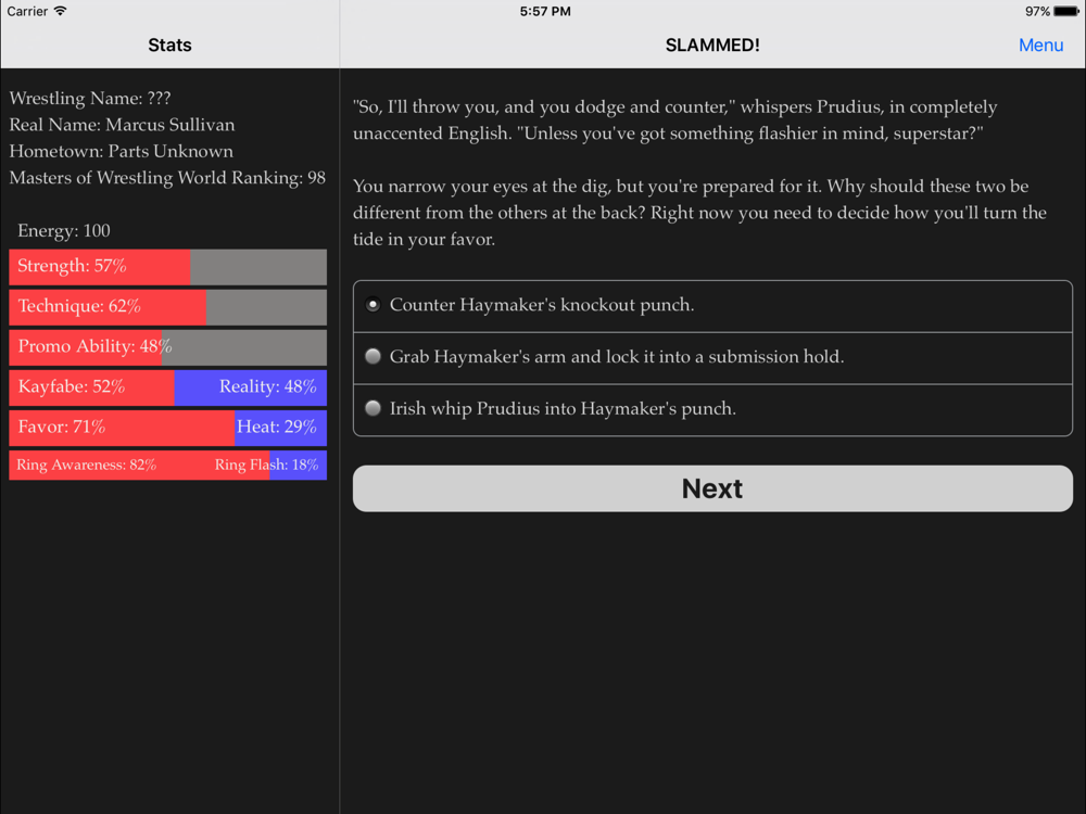 Slammed! is an epic interactive professional-wrestling novel by Paolo Chikiamco, where your choices determine how the story proceeds. The game is entirely text-based—without graphics or sound effects—but driven by the vast, unstoppable power of your imagination.