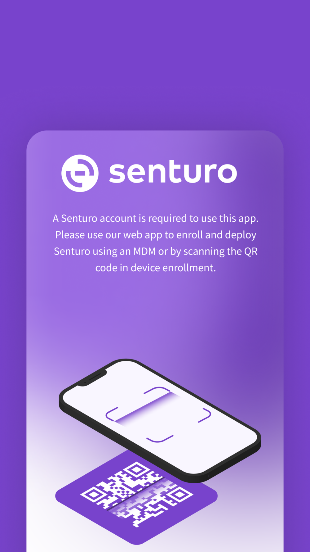Senturo for iOS requires an active Senturo account, and devices can be enrolled using the Senturo web app via MDM or by scanning a QR code.