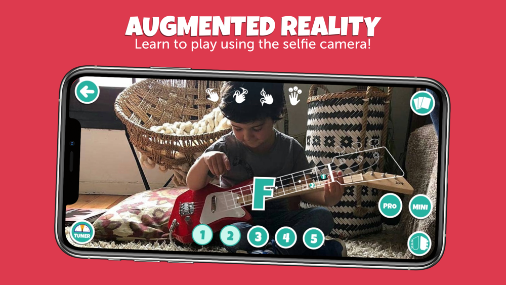 Learn to play chords using the selfie camera! Through this feature you'll see a mirrored image of yourself and dots showing where to place your fingers in order to play chords.