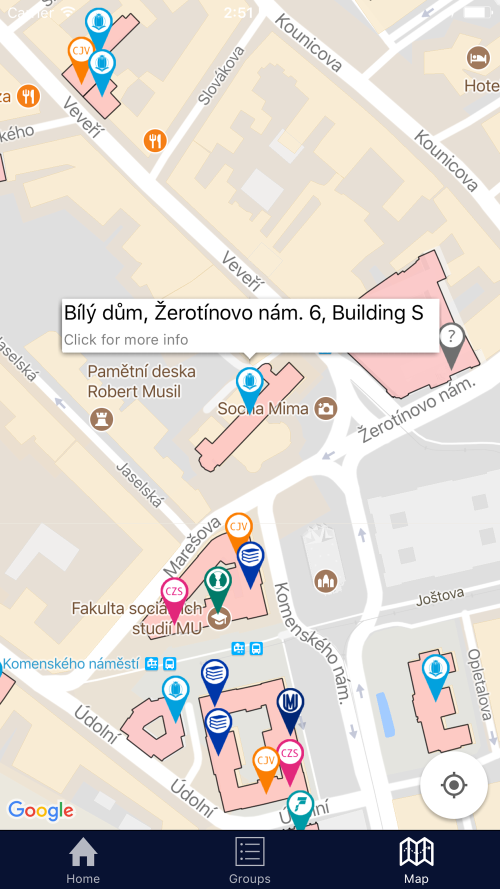 Each building is shown on the map on the basis of precise positioning. The character set for display in the map building based on the individual logos and characters faculties or abbreviations (eg UCB, SKM)