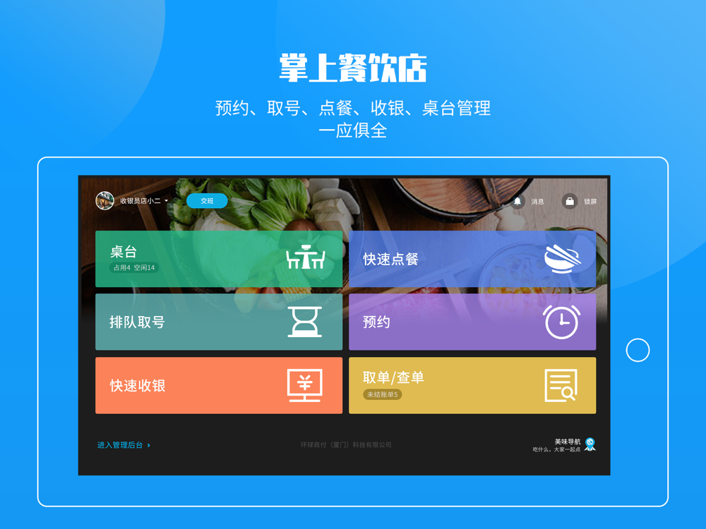 新餐饮服务平台,打造餐饮一体化服务,通过在线排队、协同点餐、预点餐、视频圈、会员系统五大功能,帮助商户洞察并解决顾客需求,优化餐饮全流程,提供一站式解决方案,从而玩转互联网新餐饮