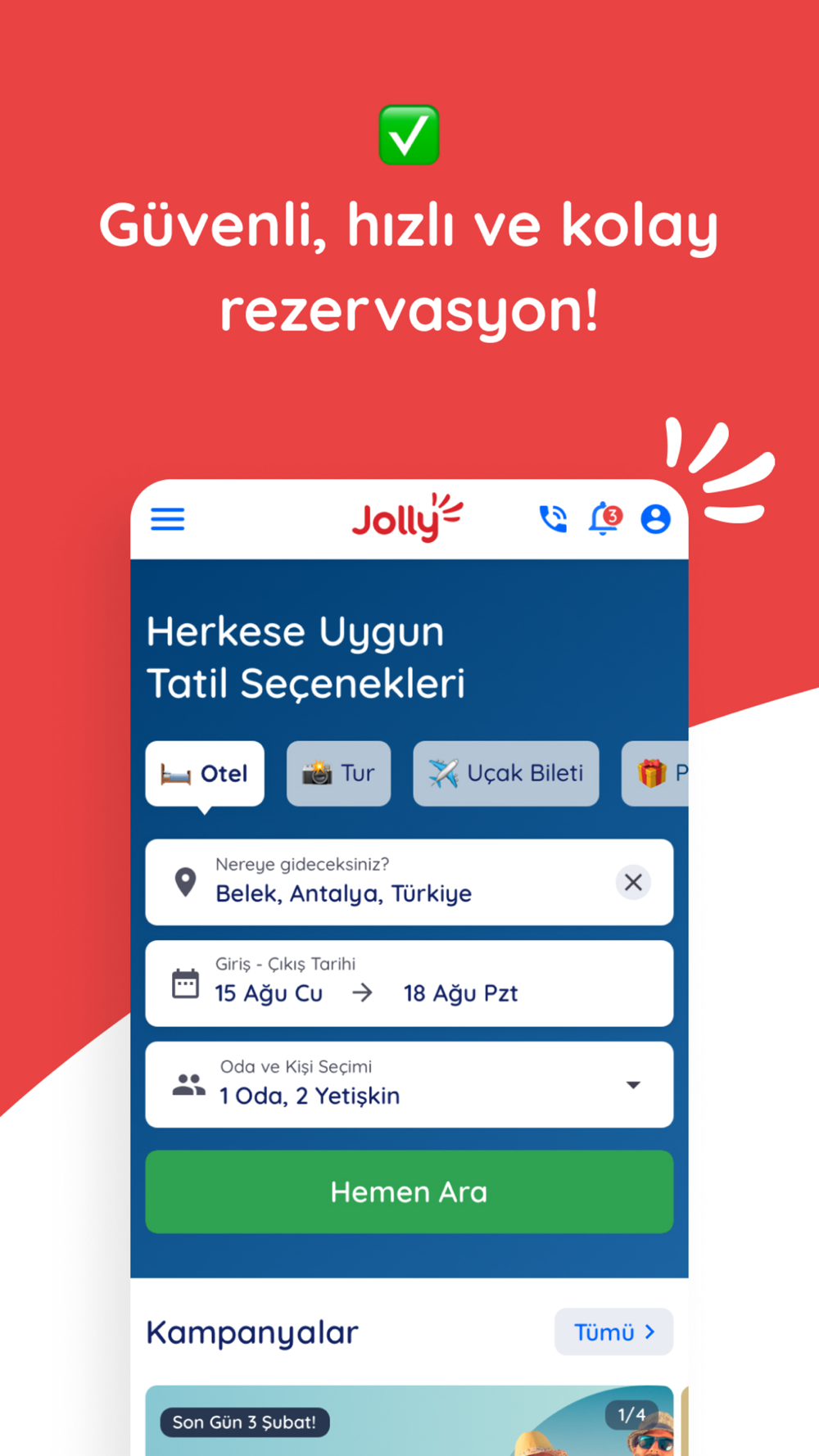 Hayalinizdeki tatili mi planlıyorsunuz? Yurt içinde ve yurt dışında binlerce farklı destinasyonda otel konaklama, tur seçeneklerinin yanı sıra; uçak, otobüs bileti, bulunduğunuz adresten havalimanına gidiş & dönüş ekonomik veya özel transfer hizmetlerinin yer aldığı Jolly’nin tatil dünyası bu mobil uygulamada! Jolly mobil uygulamasını hemen indirin, hem zamandan kazanın hem de size özel fırsatları yakından takip edin.