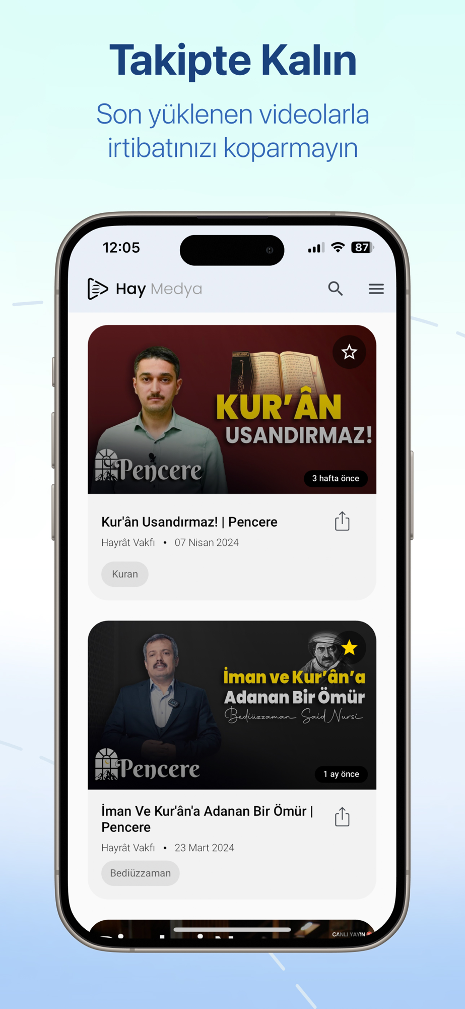 Uygulamamız, dini kaynaklardan derlenen içerikleriyle, kullanıcılarımıza kolay erişim sağlamayı amaçlamaktadır. Farklı kaynaklardan seçilmiş paylaşımları tek bir platformda bir araya getirerek, kullanıcılara içerik takibini kolaylaştırmayı hedefliyoruz. İçeriklere ana sayfadan hızlıca ulaşabilir, paylaşabilirsiniz. Kanal hakkında daha fazla bilgi almak için kanal ismine tıklamanız yeterlidir. Bildirim ayarları ile istediğiniz kanalın bildirimlerini açarak kanalın paylaşılan içeriklerinden en önce haberdar olabilirsiniz. Kanallar hakkında daha fazla bilgi edinmek isterseniz kanal ismine tıklamanız yeterli. Menü sekmesinden tavsiye kanal ve uygulamalarımıza erişebilirsiniz.