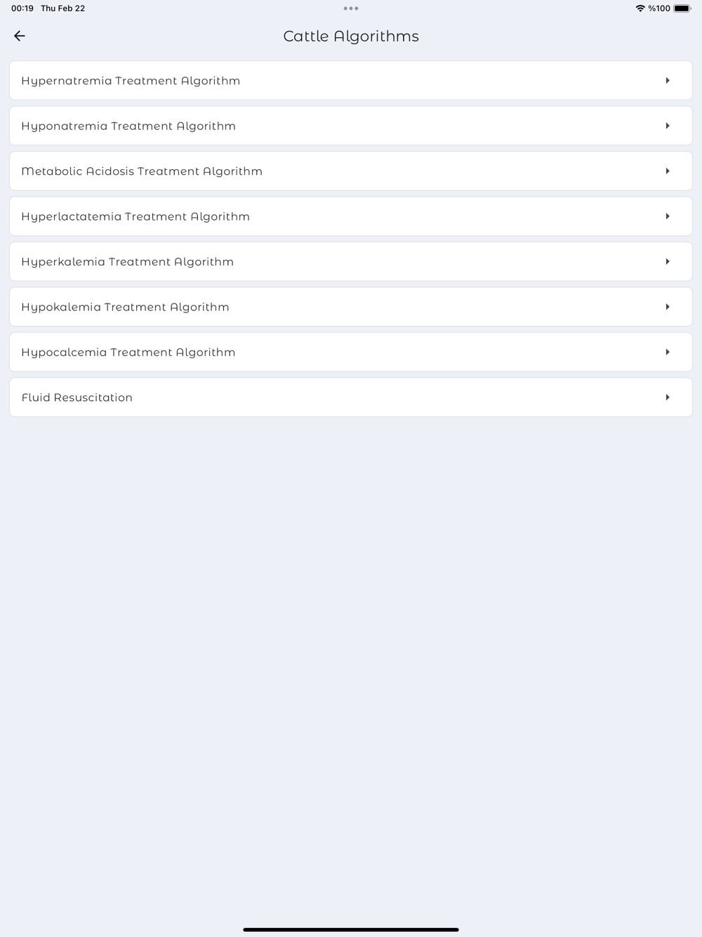 This application creates treatment protocols for veterinarians regarding the fluid and electrolyte imbalances of the patients. In this application, protocols have been established for veterinarians to use in situations such as sodium imbalances, dehydration treatment, maintenance fluids, and ongoing losses. Treatments are directed based on parameters chosen by the veterinarian, such as the animal's species, body weight, and choice of fluids to be used.