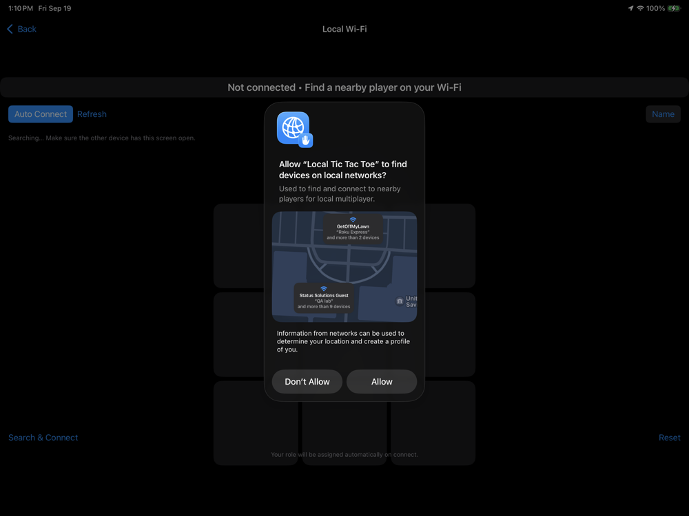 Local Wi-Fi Multiplayer with invites, custom player names, and automatic role assignment (Xs/Os)