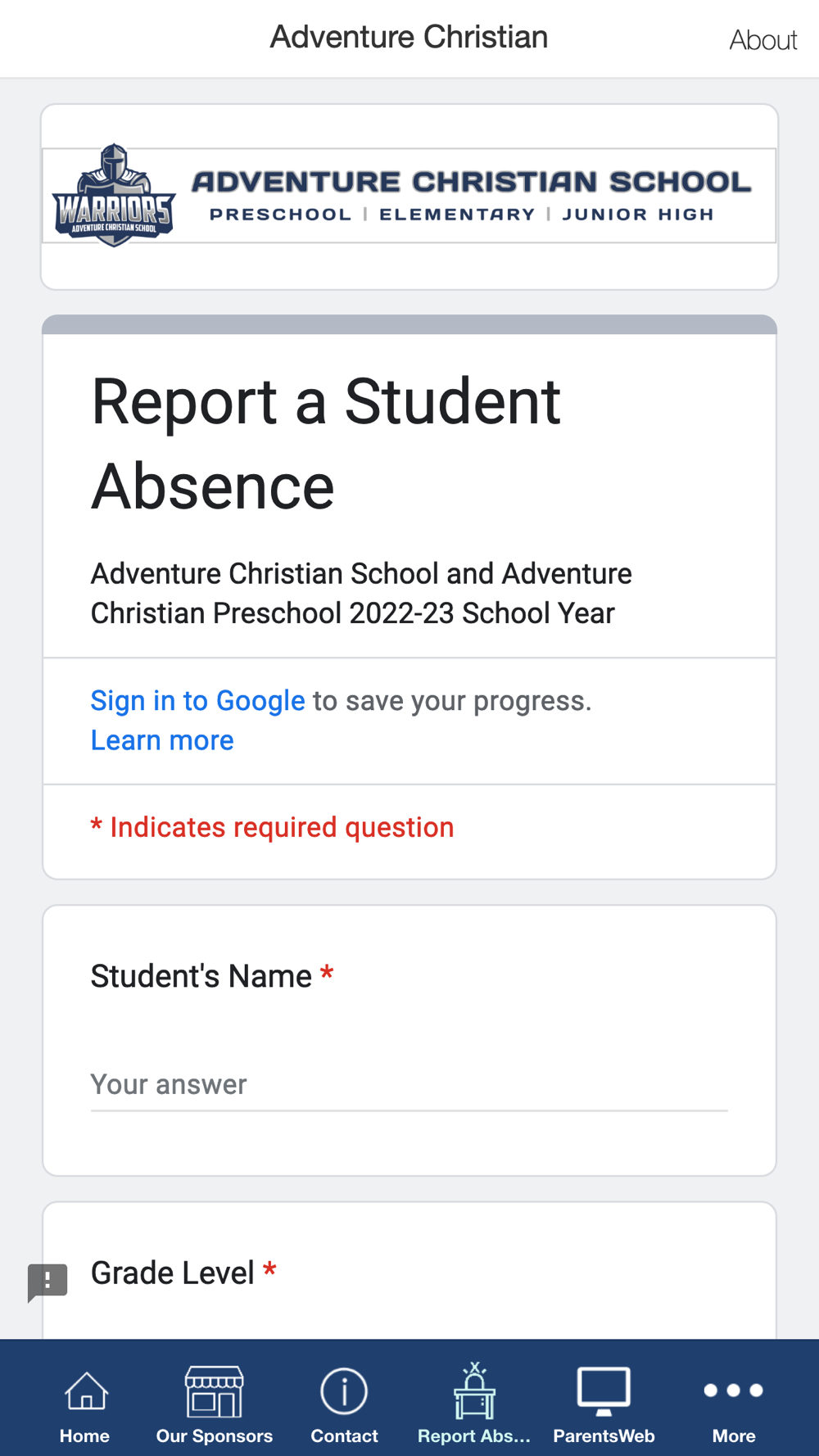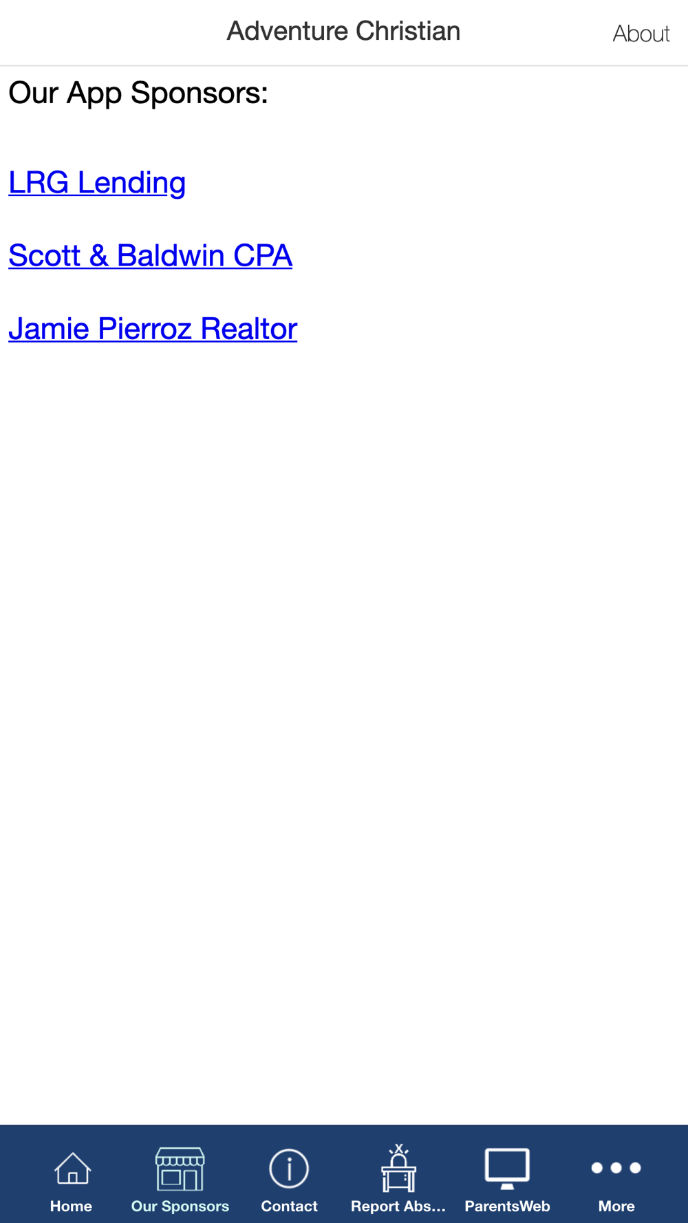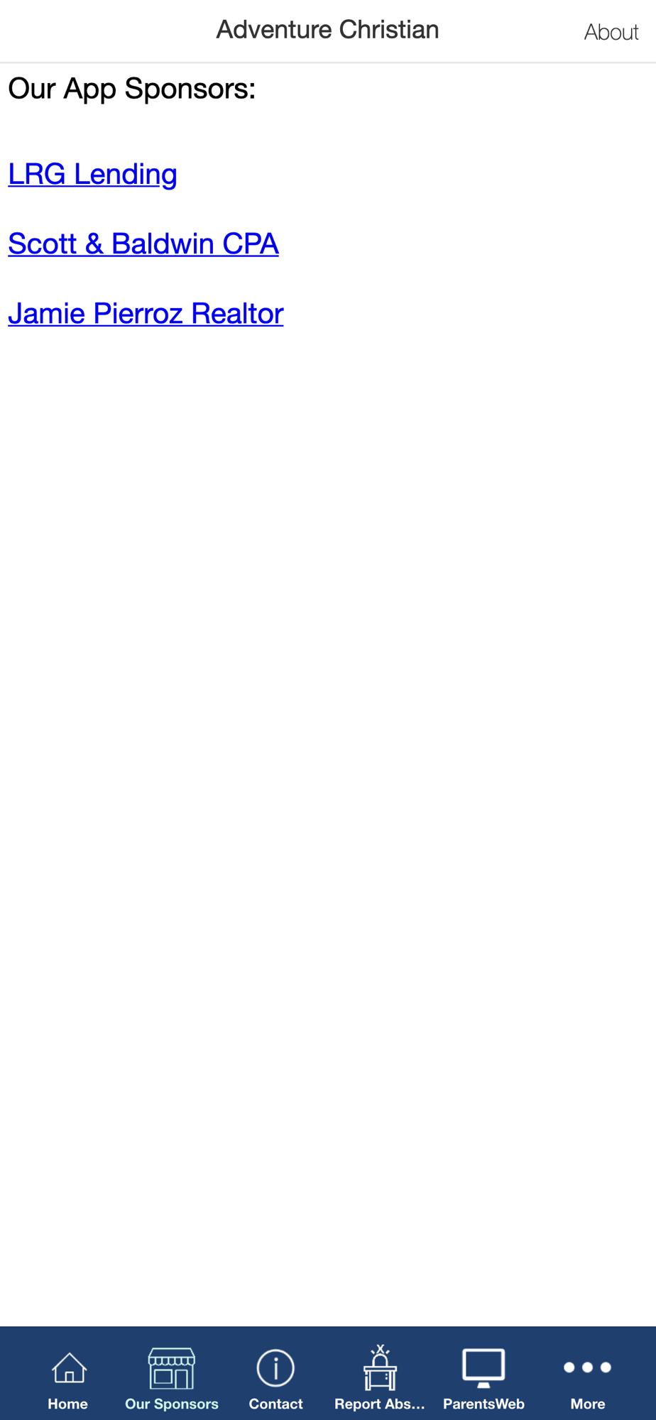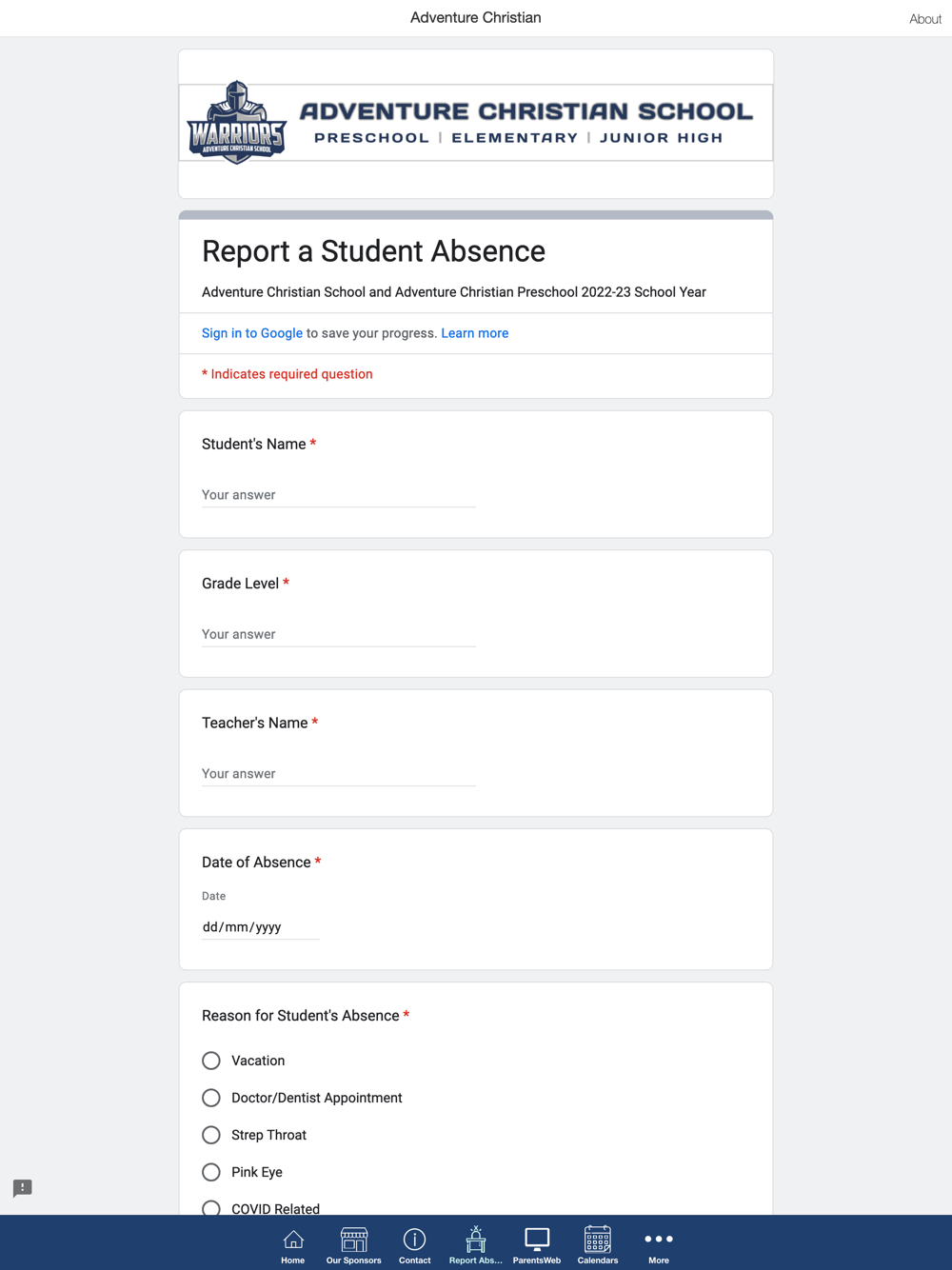 The Adventure Christian School Mobile App makes it easier than ever to stay informed with what is going on at Adventure Christian School. Our app includes program information, events, newsletters, social media, fundraisers, reporting absences, and so much more. Most importantly, we use Push Notifications to send out timely alerts!