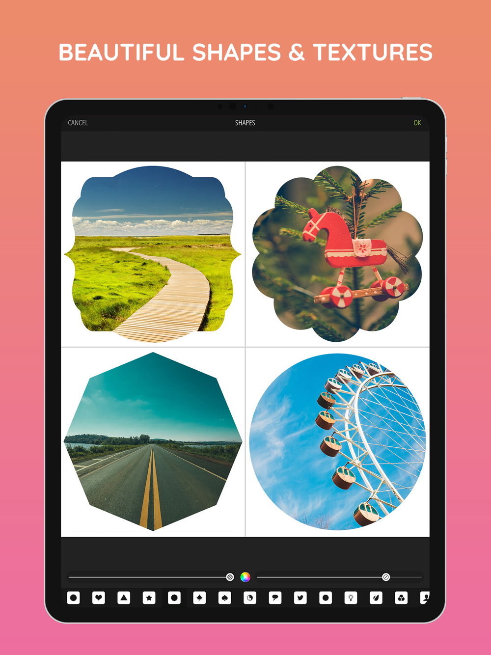 Add new colors to your photo by putting it in a shape or frame. You can choose the most suitable color or pattern for your photo.