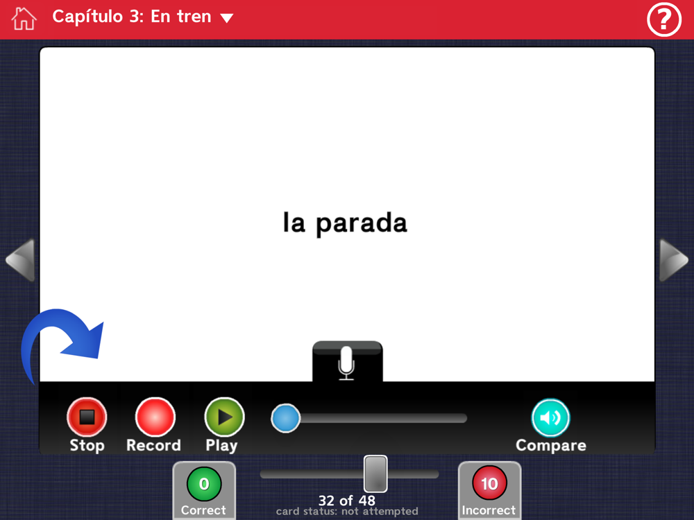 When learning Spanish vocabulary with the flashcards, you can flip the card to learn its English equivalent, listen to a native Spanish speaker pronounce the word, and even record your own voice pronouncing the word to compare it to the recorded pronunciation. You have the option to view the English word first and challenge yourself to recall the Spanish equivalent. You mark your attempts as "correct" or "incorrect" and a status bar indicates your progress.