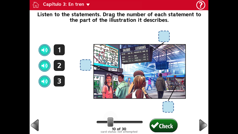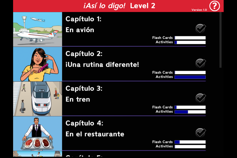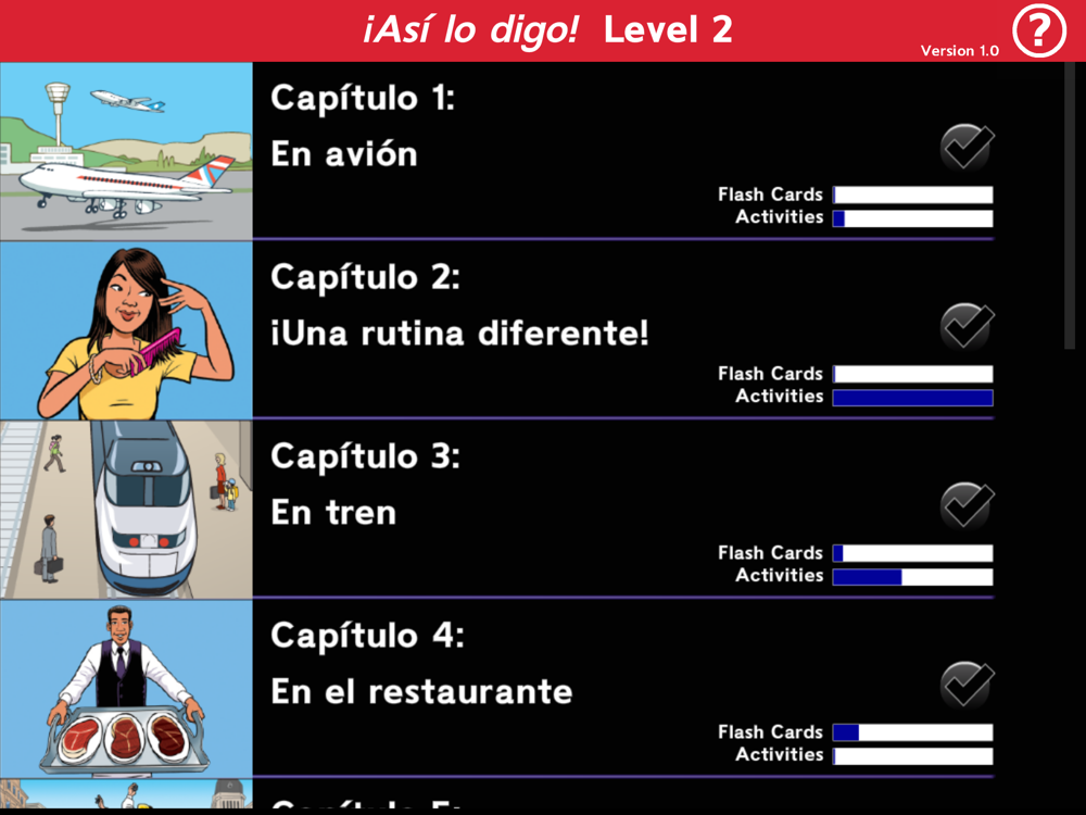 McGraw-Hill Education’s Spanish language app ¡Así lo digo! offers a quick and easy way to learn, practice, and review all the vocabulary presented in ¡Así se dice!. You can choose to study vocabulary cards or challenge yourself with contextualized activities.