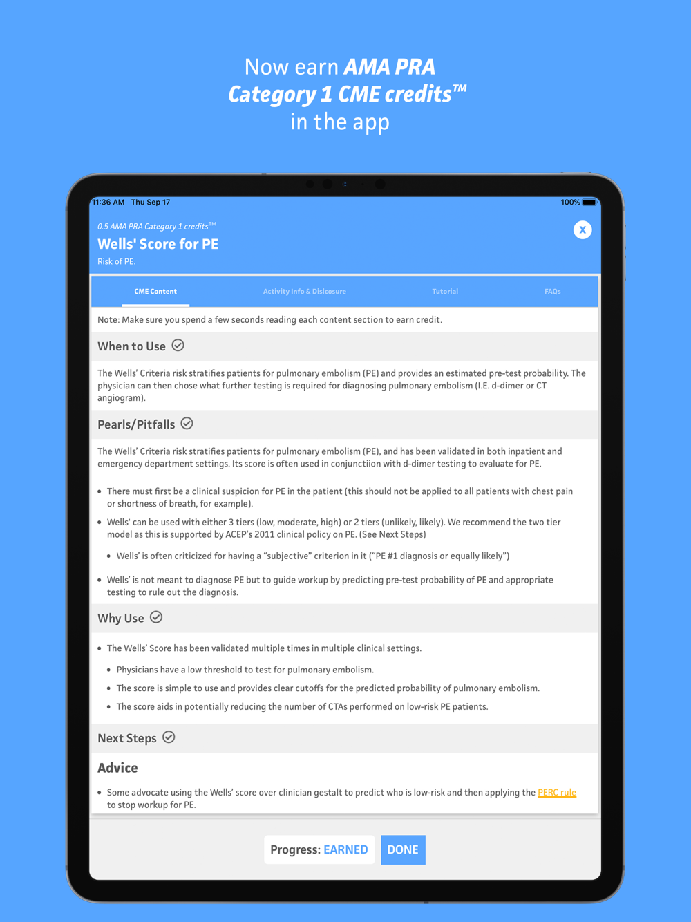 With a new enhancement, clinicians can now earn AMA PRA Category 1TM CME credits by simply reading the clinical content for 150+ calculators. The app will keep track of the CME credits earned in a personal dashboard, where users can also redeem credits for certificates and access their receipts for easy documentation. In order to redeem CME credits, users will need to sign up for a paid CME plan.