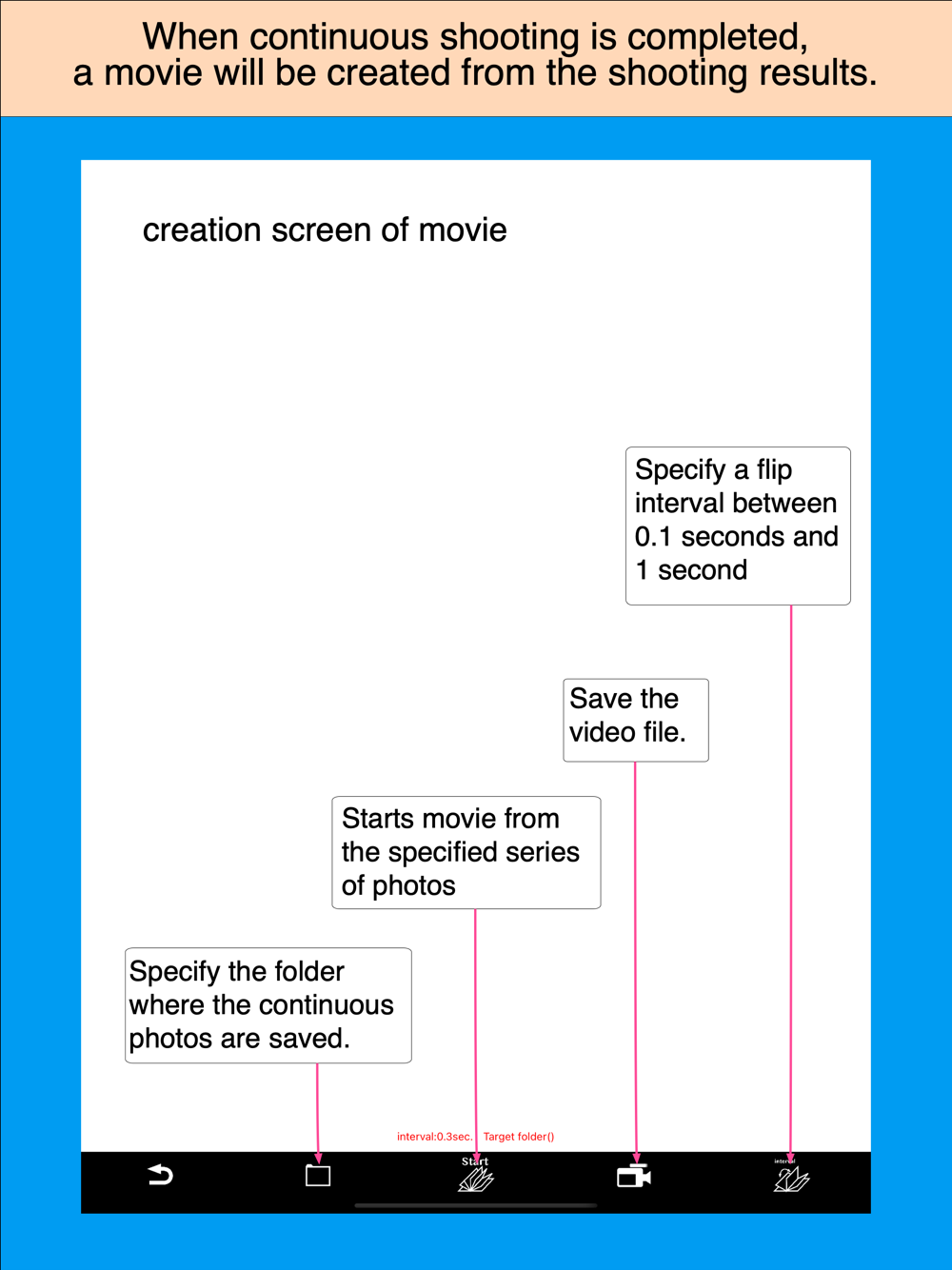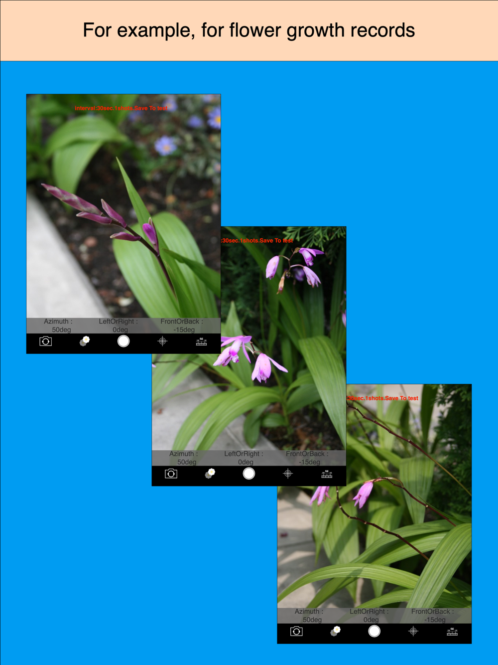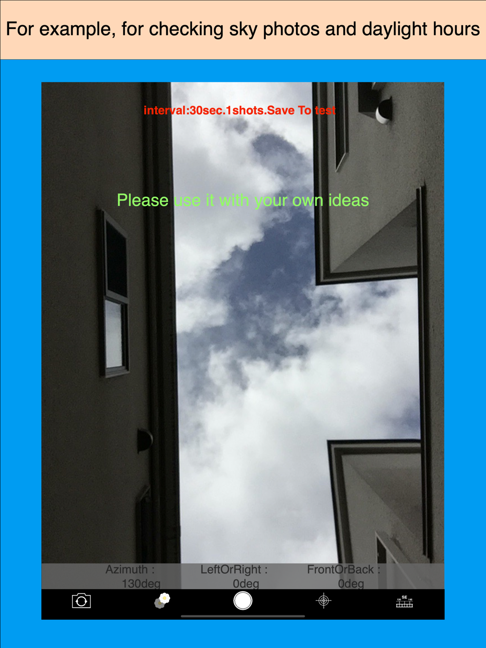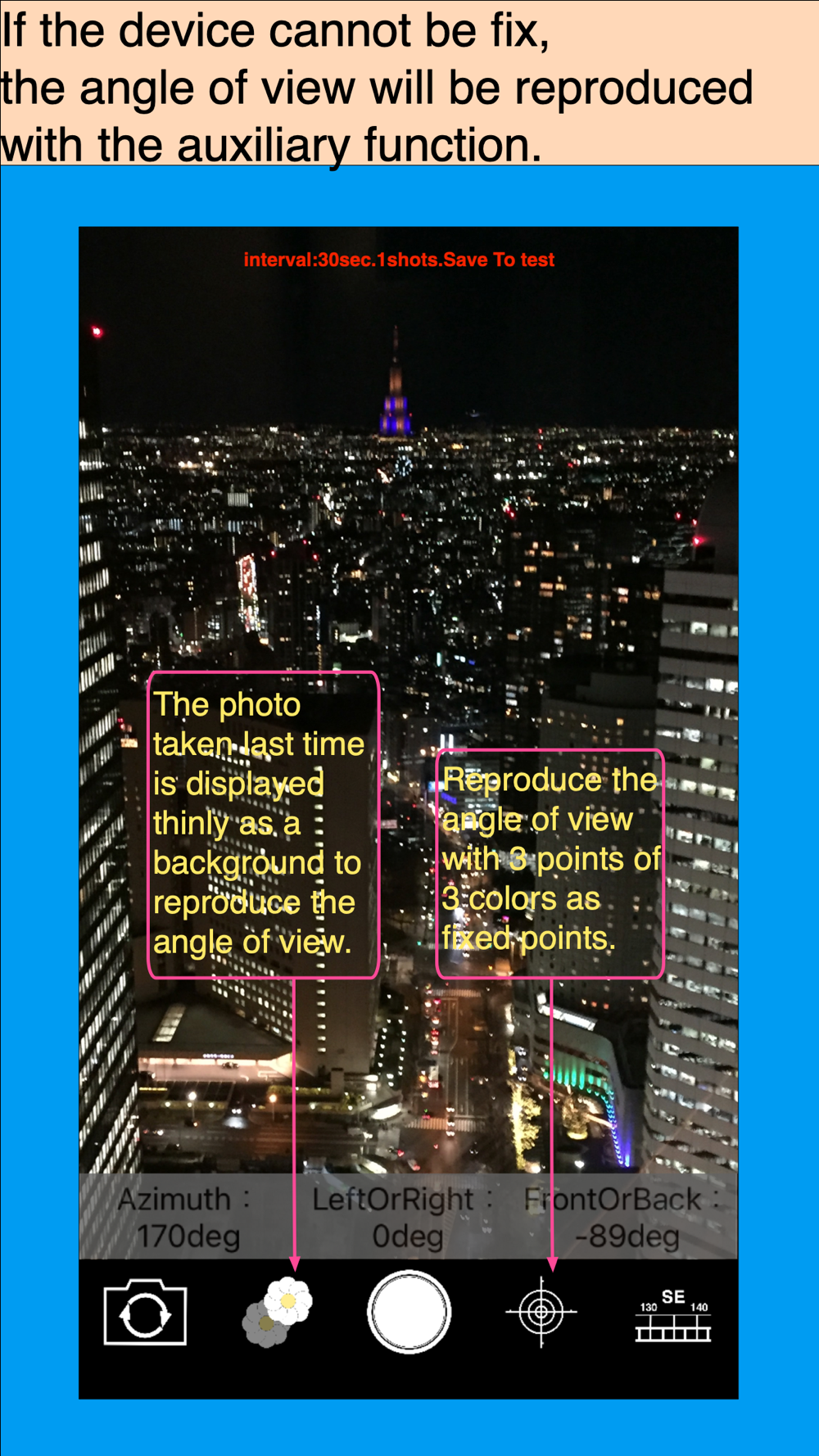 This app is a camera application, for a long time equidistant still image shooting, or if equidistant photography is not possible, is a camera application that has a function to easily reproduce the same angle of view.