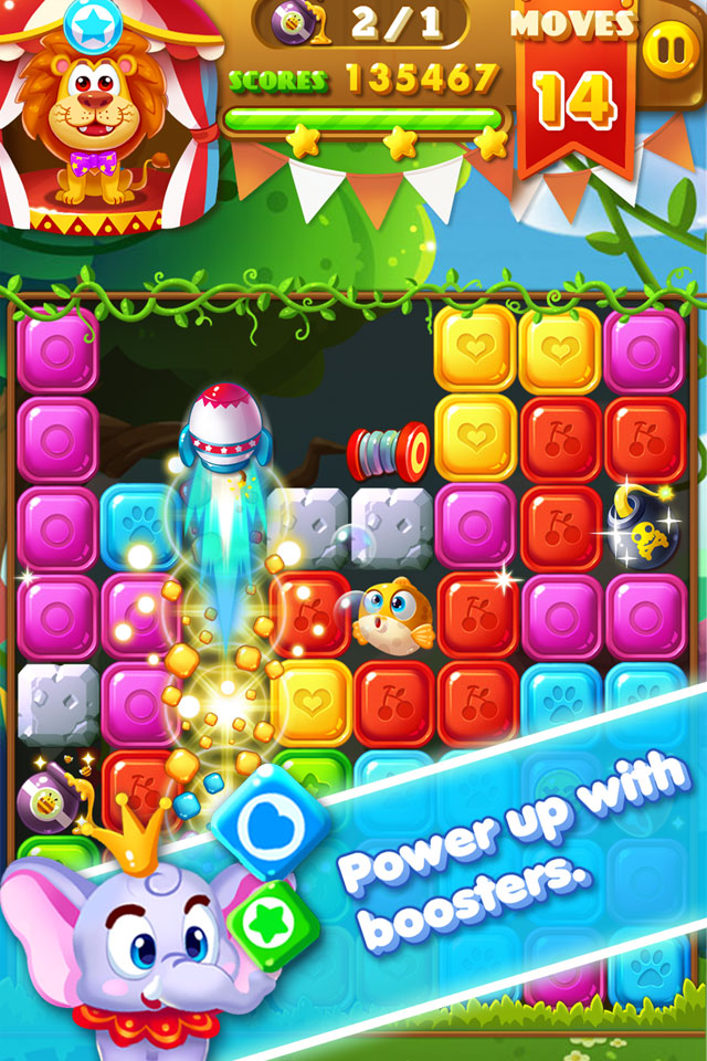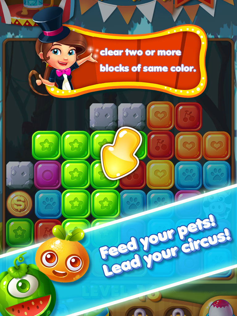 Tap on two or more same color blocks, collect food to feed pets and lead your circus!