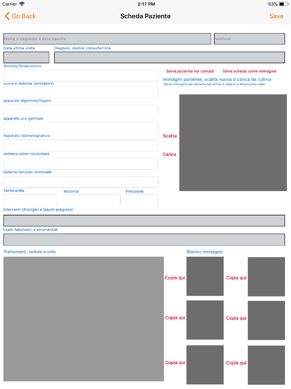 si può salvare il paziente nei contatti ipad o esportare la scheda come immagine.