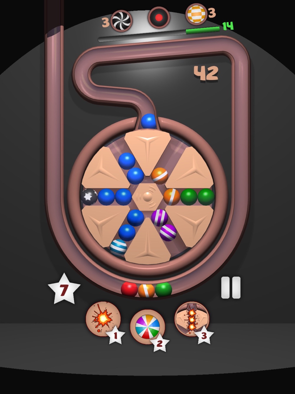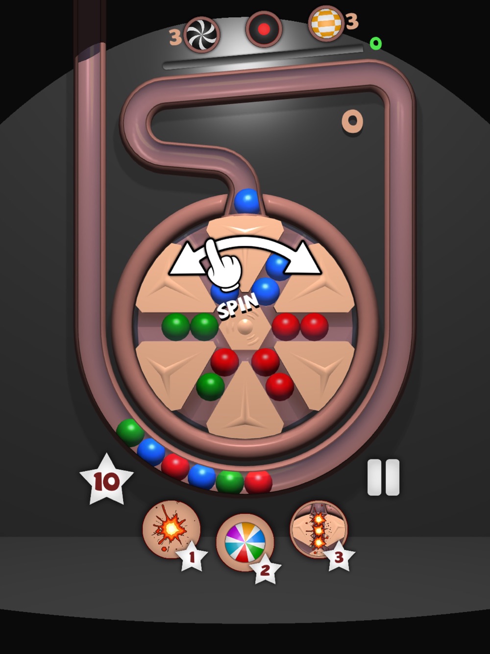'Spinis' is the unique puzzle game. Spin the wheel and group same-colored balls. Third same-colored ball will remove all same-colored balls in that slot and neighborhood slots. More balls will be removed more higher value balls will apear and more points will be added to your score. If you stuck you can use bonus buttons to remove coming ball, convert coming ball in to all-colored ball and free up one slot if you need additional space. It will cost you stars. Every game begins by transferring 10 stars from your bank to the game. Additional stars you will earn in the game. Remove 50 balls and get one of powerful balls. Beginning is easy - continuing hard or not. Find it yourself.