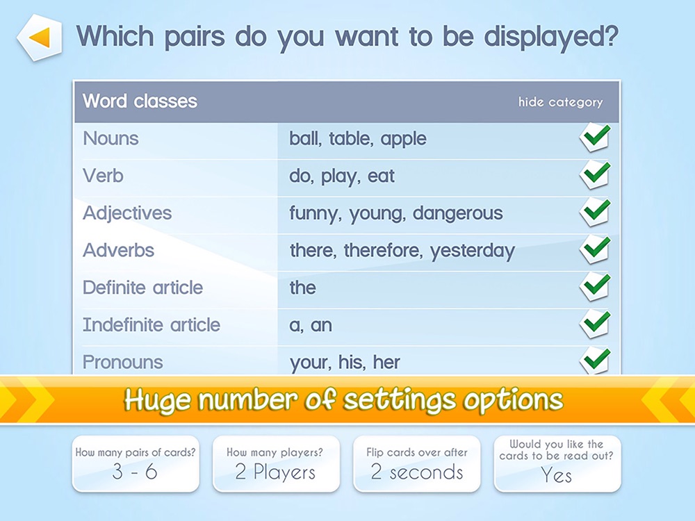 Both the number of card pairs and the number of players are, of course, variable. Depending on your wishes, the cards can be read aloud, and the length of time in which the cards are revealed is adjustable. The difficulty level of the app increases with the number of card pairs and the chosen area of grammar. It is aimed at all students who are not yet entirely comfortable in their use of grammatical terms or who want to practice for their next grammar lesson in a fun way. You can also work on improving your spelling.