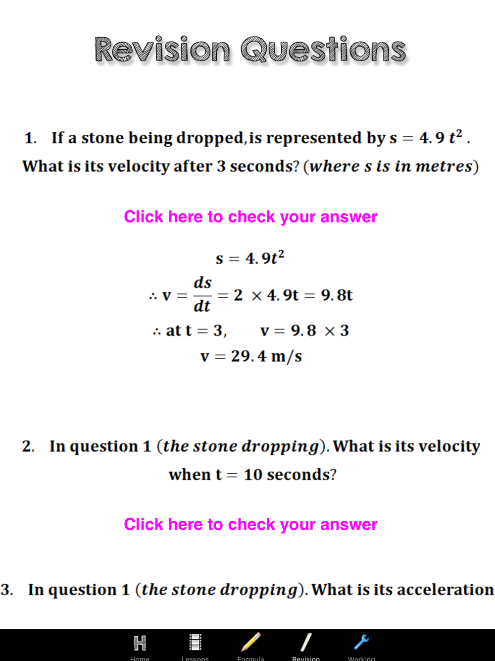 Motion in a Straight line has tutored lessons which shows step by step worked examples as well as Formulas.