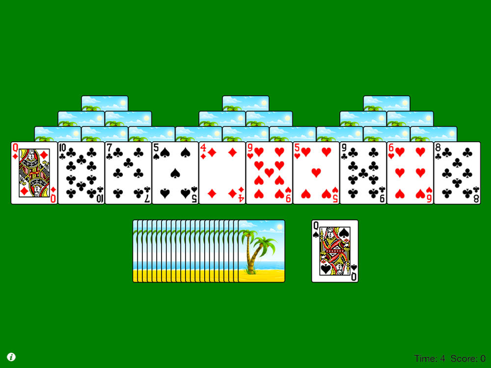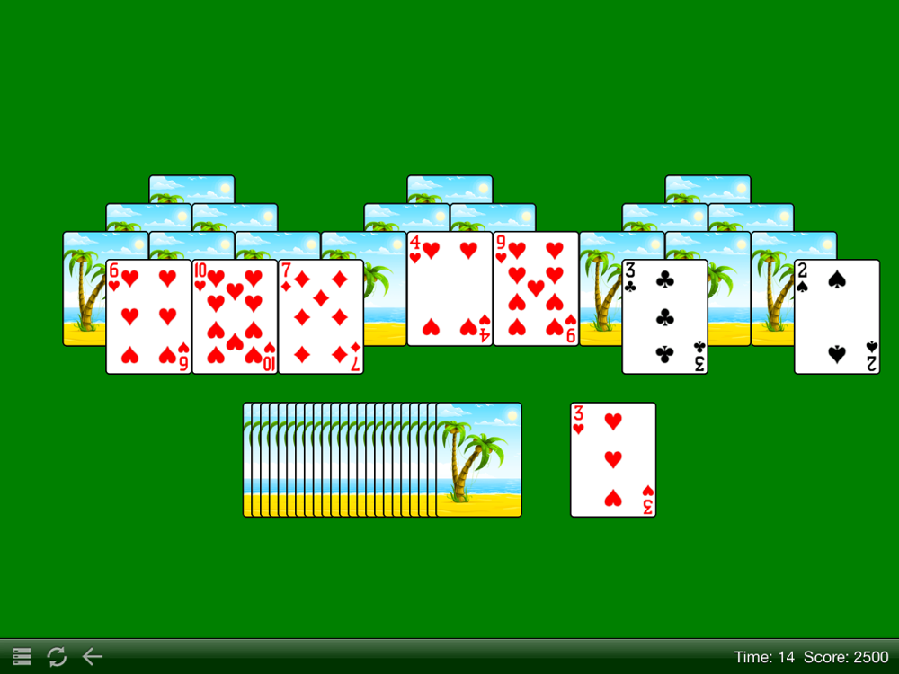 The game starts with eighteen cards dealt face-down on the tableau to form three pyramids with three overlapping tiers each. Over these three pyramids are ten face-up cards.