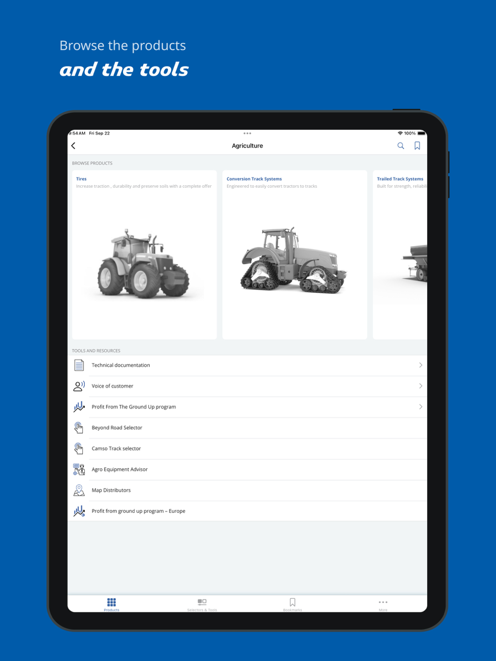 The Beyond Road Connect application is dedicated to the off-road mobility market from Michelin. It was developed as a field guide for our commercial representatives and partners to navigate the subtleties of tires, tracks and track systems for industries such as agriculture, construction and material handling.