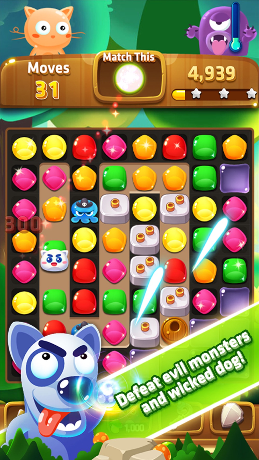 - An addictive match-3 adventure challenged with evil monsters and wicked dog.