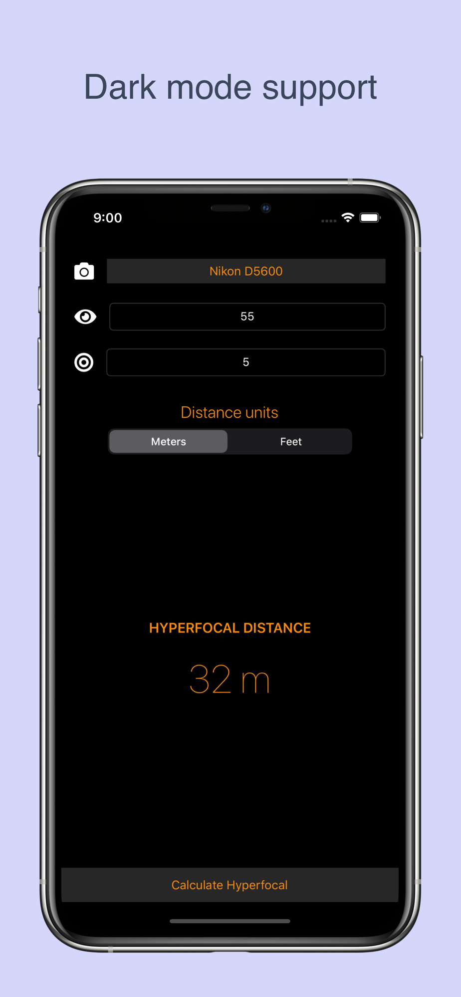 With this app, you can calculate hyperfocal distance in an easy way. Just pick your camera model from the list, set your focal length and aperture used, and click on "Calculate Hyperfocal". That's all!