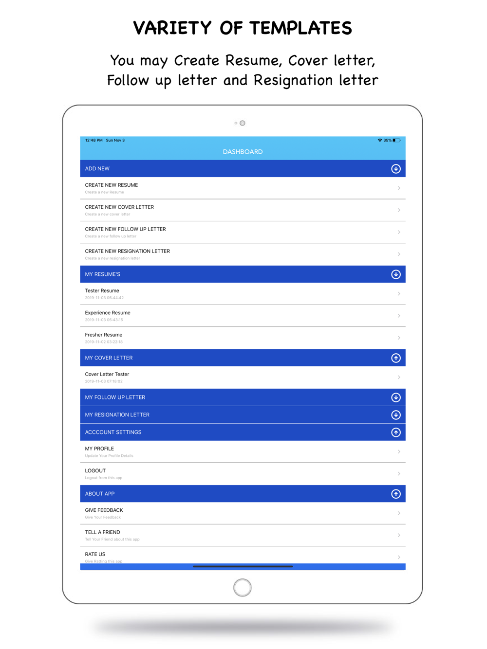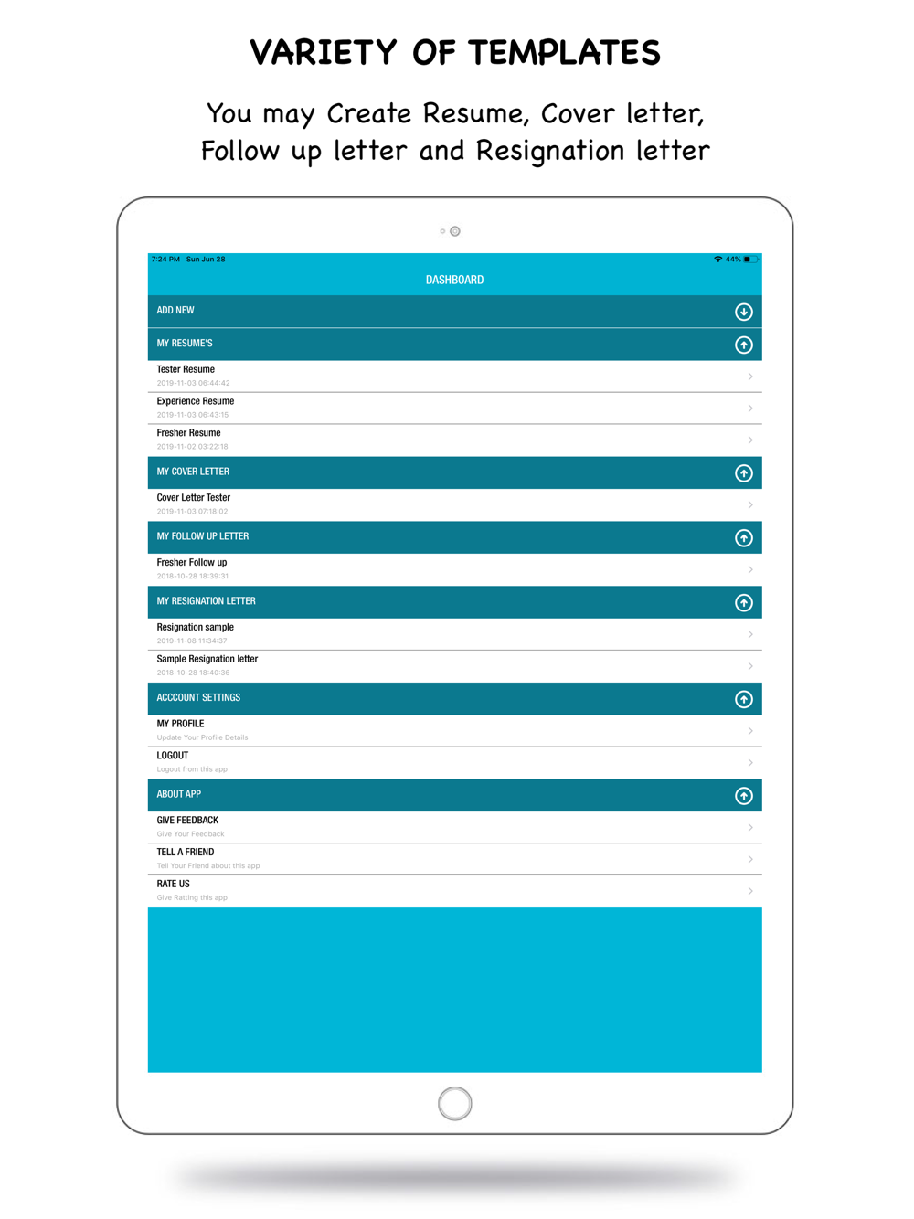 Resume Builder App lets create a simple, beautiful and professional resumes in minutes. It is so simple, quick to create a great resume in click. There is no any step-by-step process to enter your information in the fields.