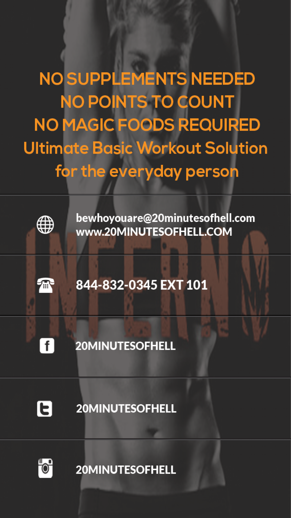 20 MINUTES OF HELL IS THE ULTIMATE WORKOUT SOLUTION FOR THE EVERYDAY PERSON. The underlying chief focus of the 20 MINUTES OF HELL brand is to educate and empower individuals with lifestyle-compatible exercises encompassed with precise knowledge of core fitness training. Psychologically, people struggle to control their temptations and internal desires in maintaining healthy eating and workout regimens. 20 MINUTES OF HELL is hyperfocused on educating and training the mental powers of the individual by exposing the myths of fitness and implementing their new 20 MINUTES OF HELL lifestyle. Our blueprint of success renders results within three minutes and the remaining seventeen minutes is game-changing. Understanding how your body functions and reacts to specific training exercises is one of our key ingredients. The body is the most advanced specimen in the world and few understand the master dynamics of core fitness development.