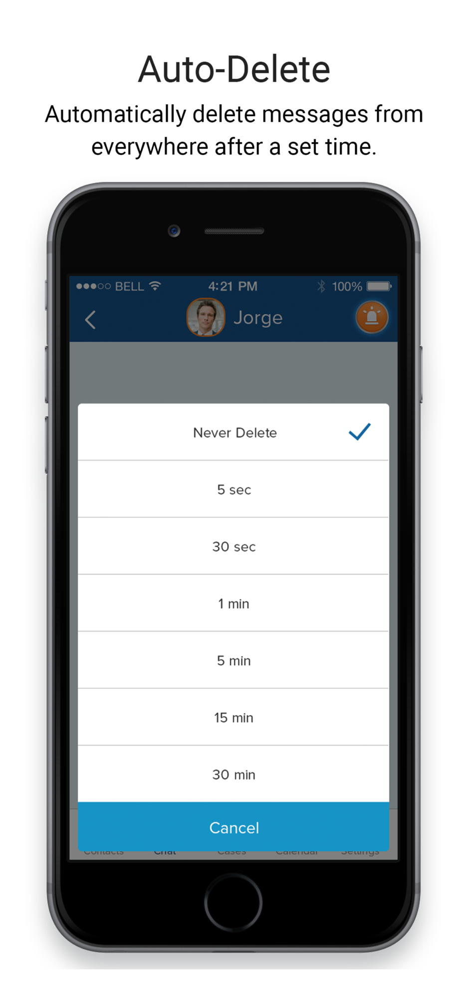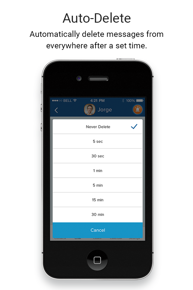 All messages, documents and images are encrypted with 256 bit encryption. You are able to recall and delete messages from every device that received it. We also do not keep a history of your messages on our servers and do not store them anywhere.