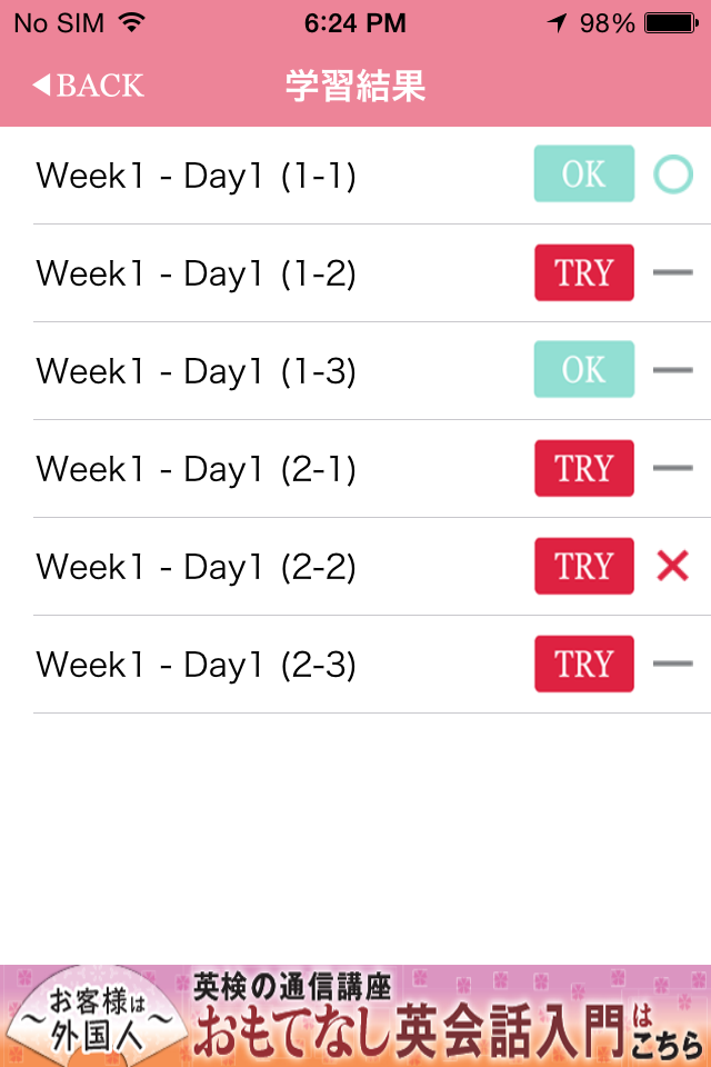 ・通信講座のテキストと同じ英文が言えたと判定されると右上にOKマークが表示されます。