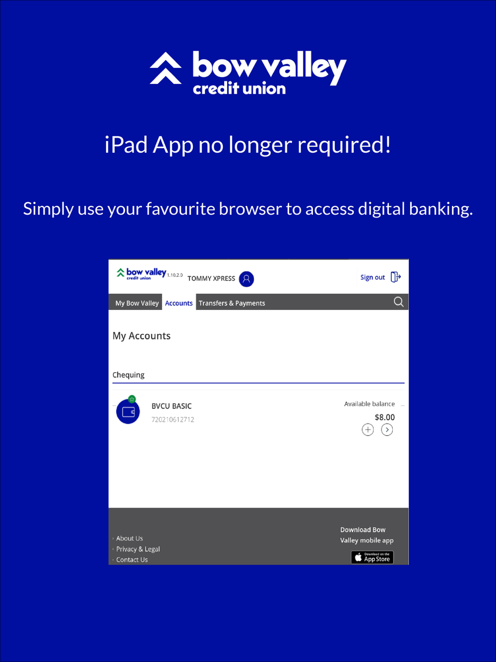 In order to use Bow Valley Credit Union’s mobile app you must be a member. Visit bowvalleycu.com for more information.