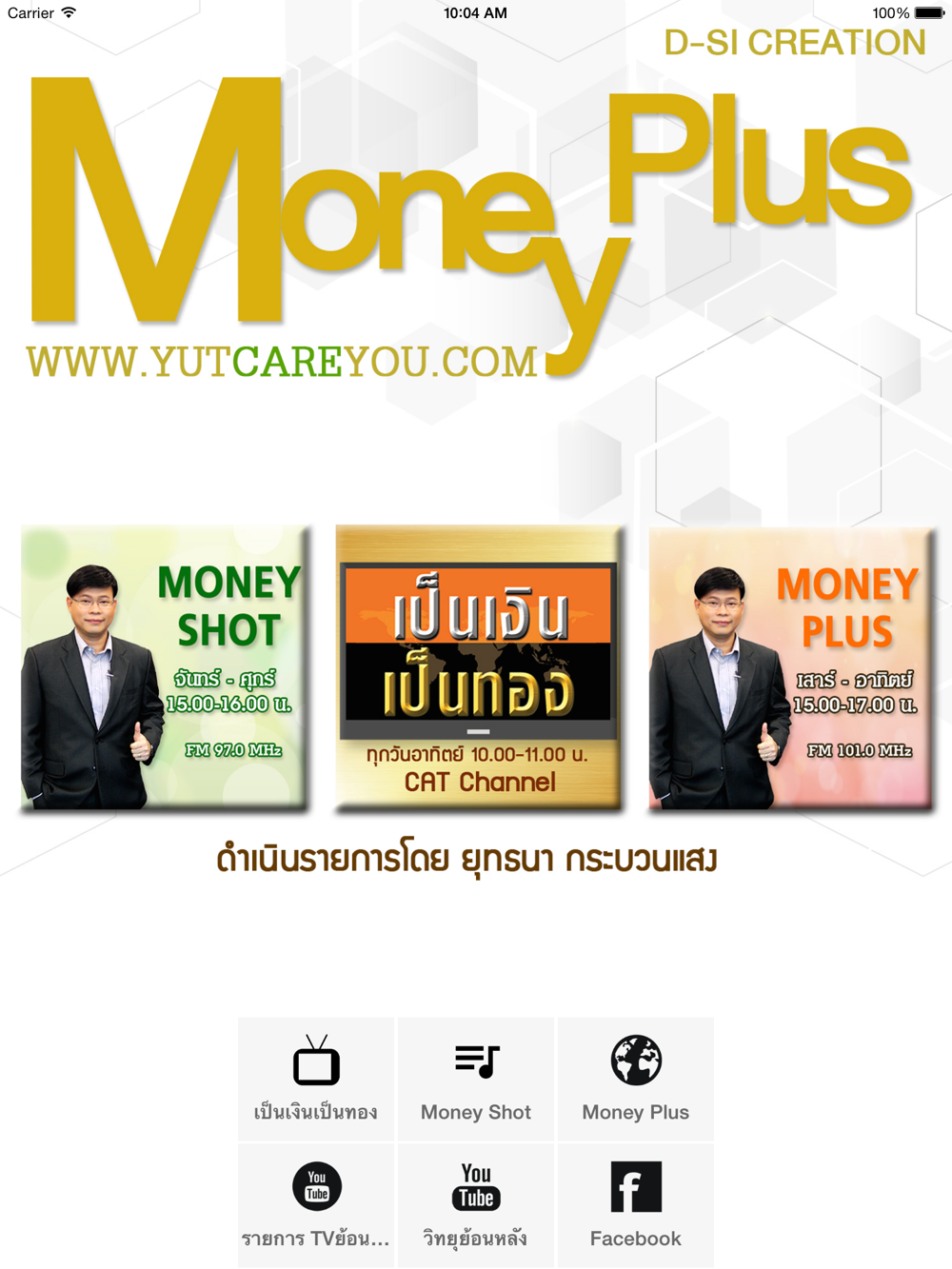 Money Plus ฉลาดลงทุน เพิ่มพูนเงินออม เป็น Application สำหรับนักลงทุนและผู้ที่สนใจข่าวสารด้านการลงทุน ทั้งเรื่องเศรษฐกิจ การเงิน การลงทุน ตลอดจนการวางแผนเพื่อการเกษียณ ฯลฯ ซึ่งจะช่วยให้คุณสามารถติดตามรับฟังรายการวิทยุ Money Shot . Money Plus และรายการทีวี เป็นเงิน เป็นทอง ดำเนินรายการโดย คุณยุทธนา กระบวนแสง ได้อย่างสะดวกและรวดเร็ว จึงเป็นอีก 1 ช่องทางของเคล็ดลับสู่ความมั่งคั่ง เส้นทางสู่ความร่ำรวยอย่างความยั่งยืน