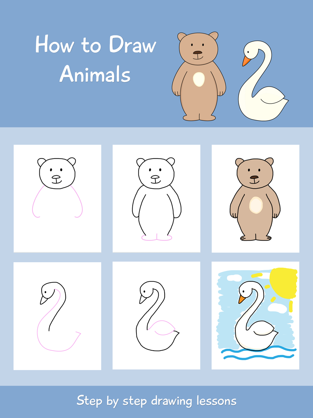 Kids can draw a picture in 6 to 8 steps starting from a basic circle and ending with a real drawing.